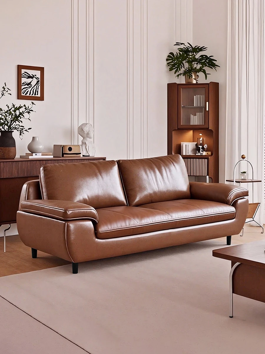 Jianye Genuine Leather Sofa - Italian Minimalist Retro Design for Small Living Rooms, Top Grain Cowhide, Straight-Line Three-Seat Leather Sofa