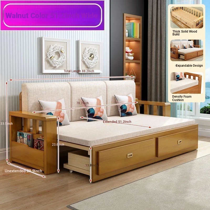 51.18inX88.19in [Retractable + Multifunctional] Free Installation/Walnut [Solid Wood Sofa Bed] + Removable Mattress + Multiple Gift