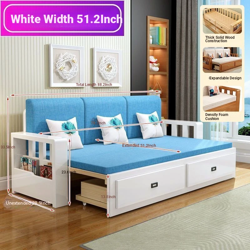 51.18inX88.19in [Retractable + Multifunctional] Free Installation/White Paint [Solid Wood Sofa Bed] + Removable Mattress + Multiple Gift