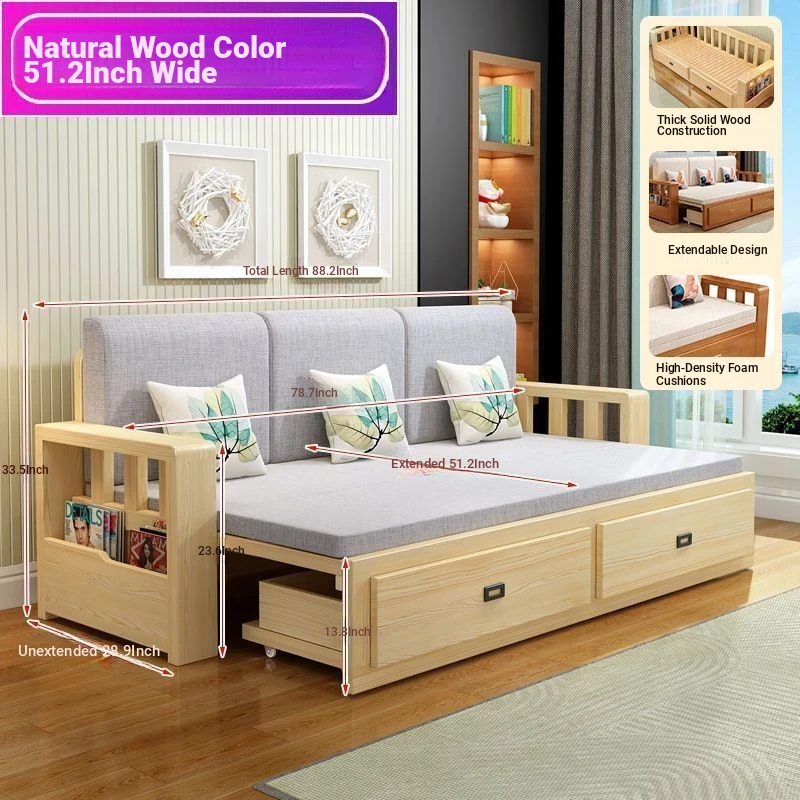 51.18inX88.19in [Retractable + Multifunctional] Free Installation/Log [Solid Wood Sofa Bed] + Removable Mattress + Multiple Gift