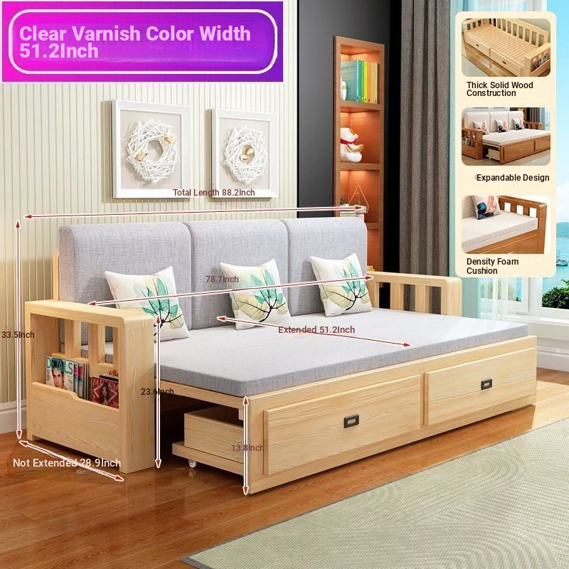 51.18inX88.19in [Retractable + Multifunctional] Free Installation/Varnish [Solid Wood Sofa Bed] + Removable Mattress + Multiple Gift