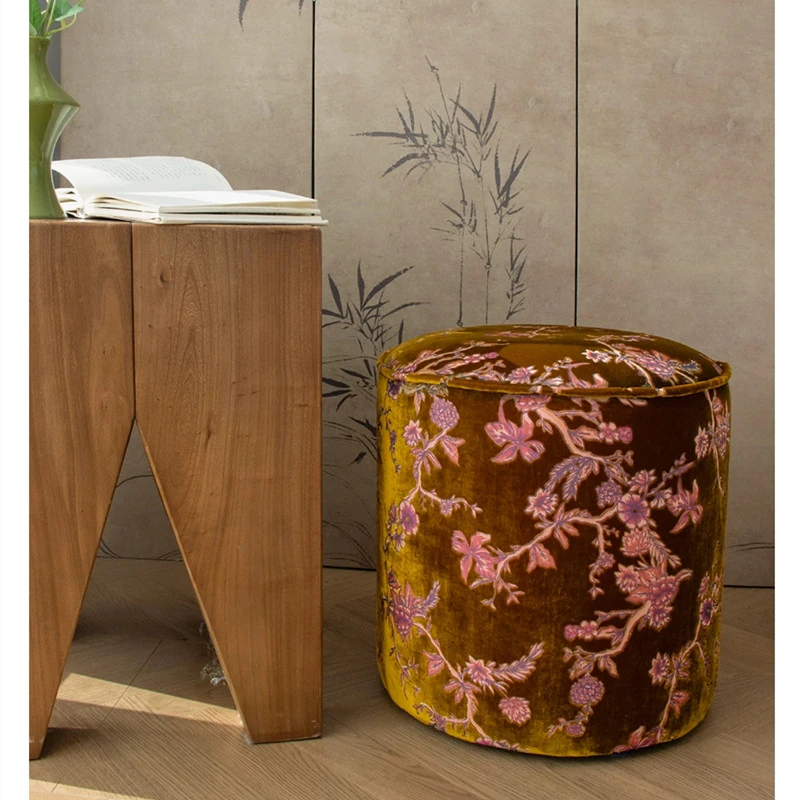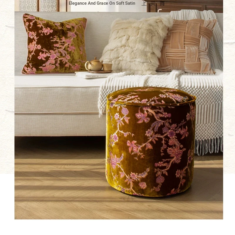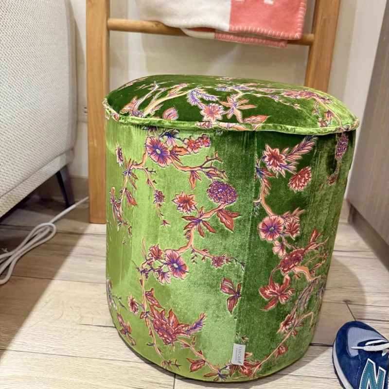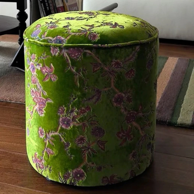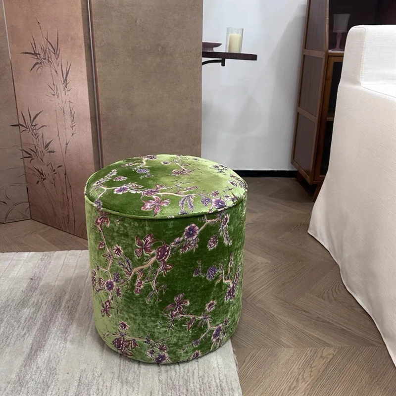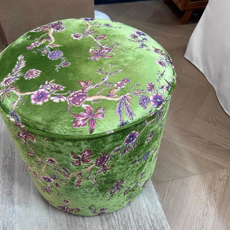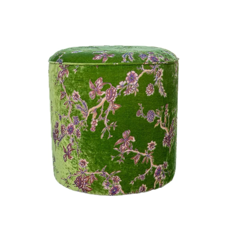 French Vintage Green Velvet Jacquard Ottoman - Chic Chinese Style Round Stool for Living Room, Solid Wood Soft Cushion Seat, Perfect Shoe Changing Bench