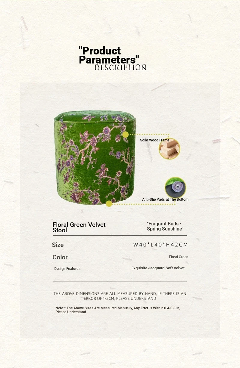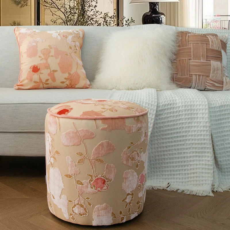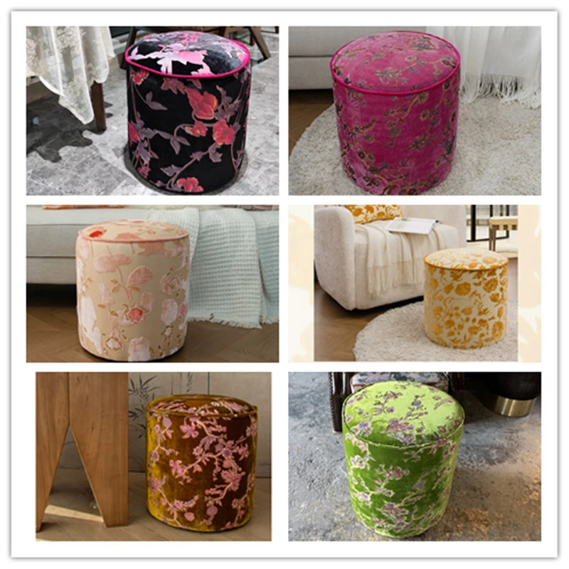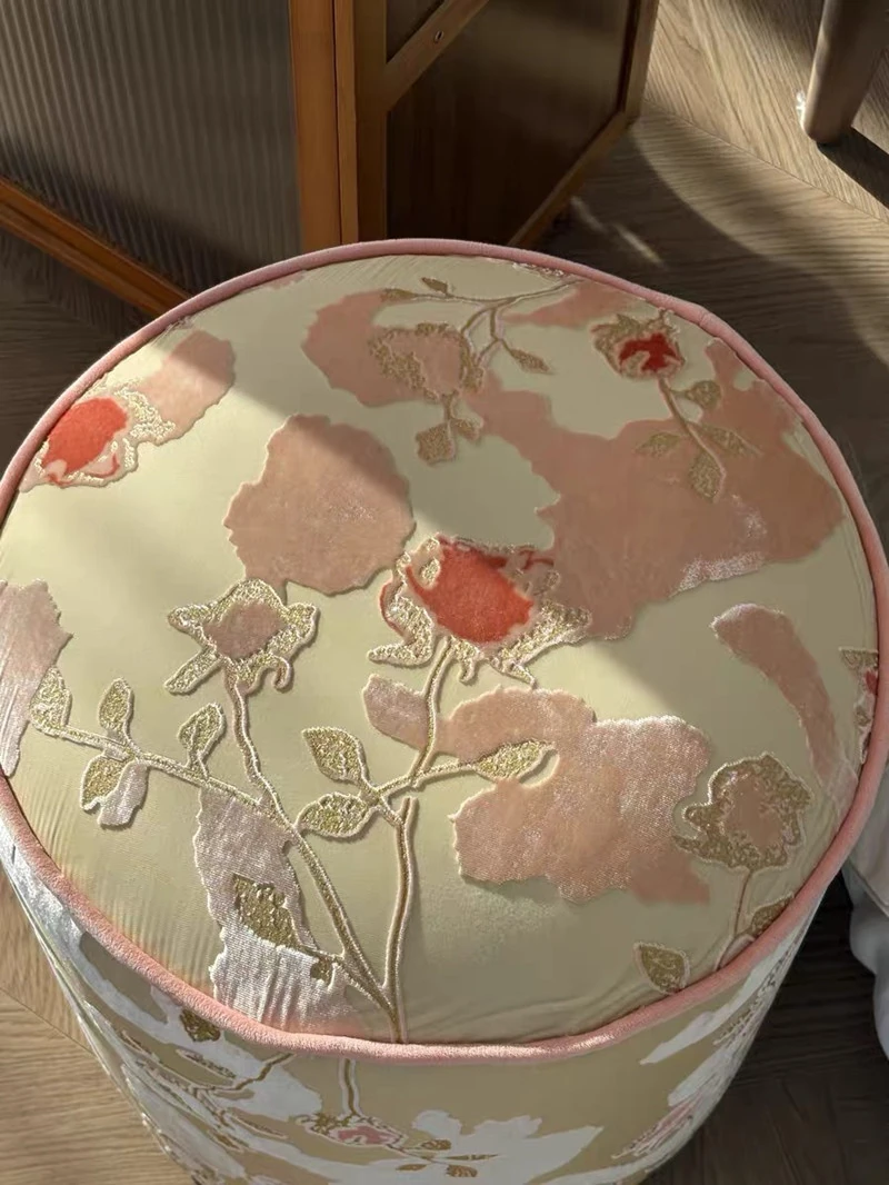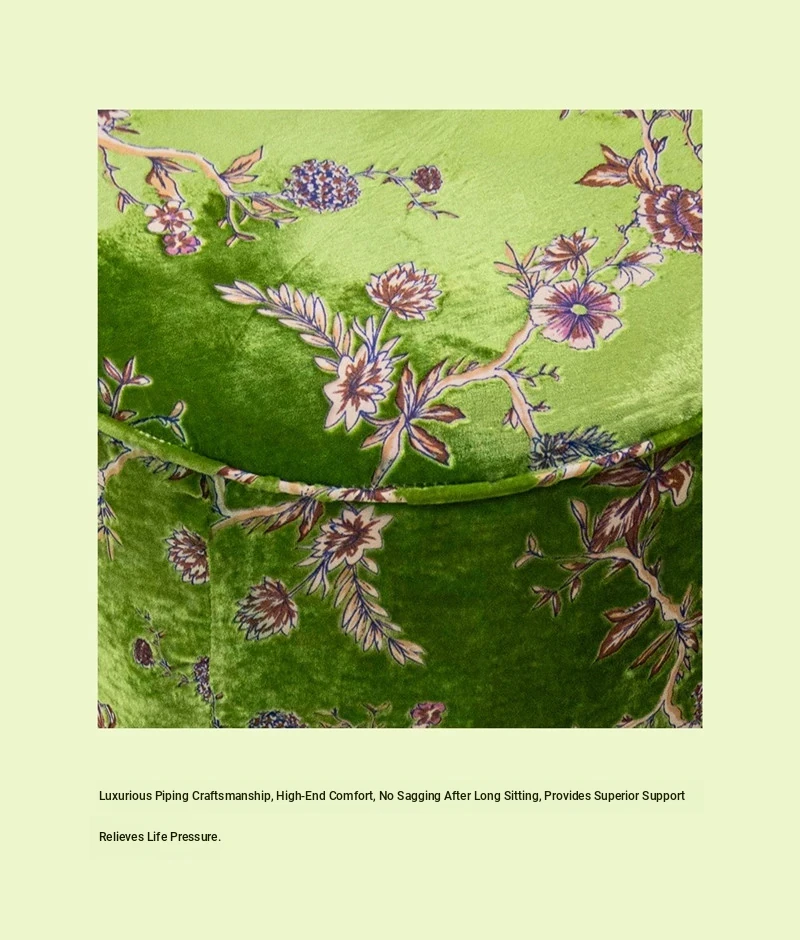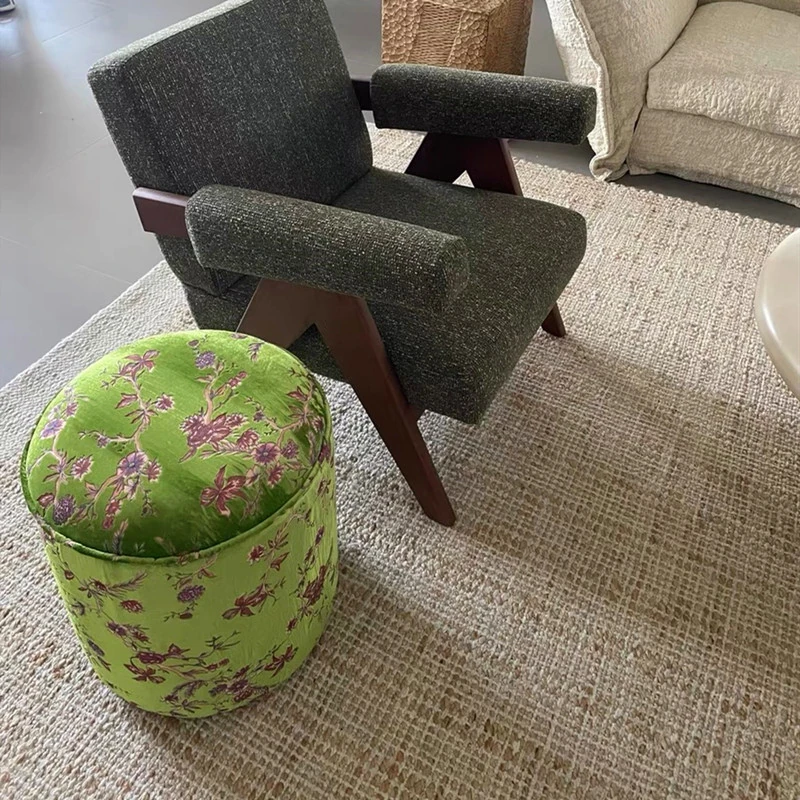 French Vintage Green Velvet Jacquard Ottoman - Chic Chinese Style Round Stool for Living Room, Solid Wood Soft Cushion Seat, Perfect Shoe Changing Bench