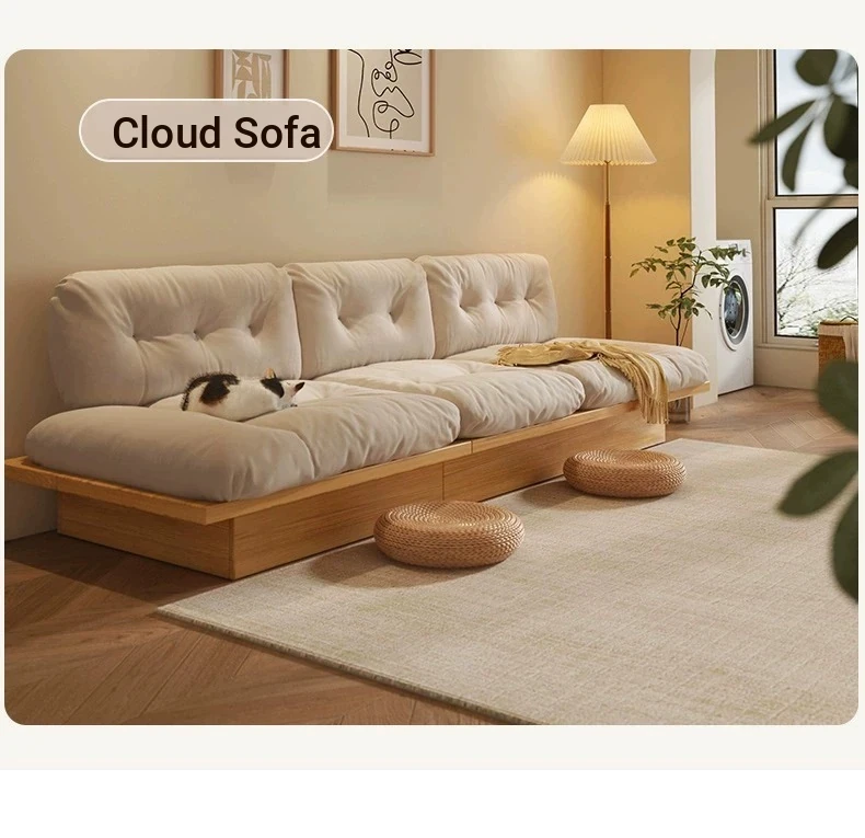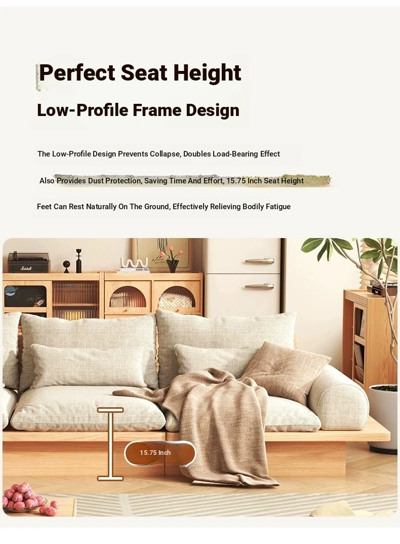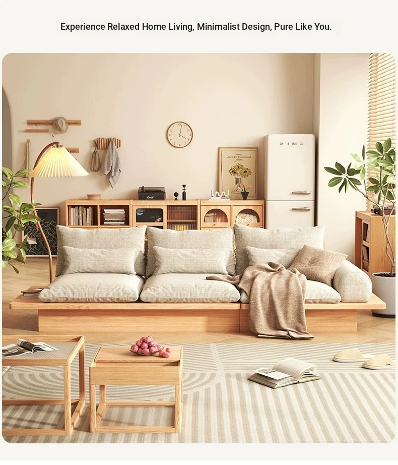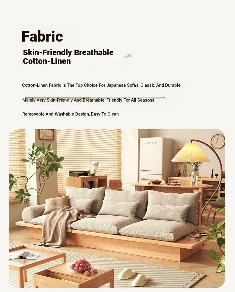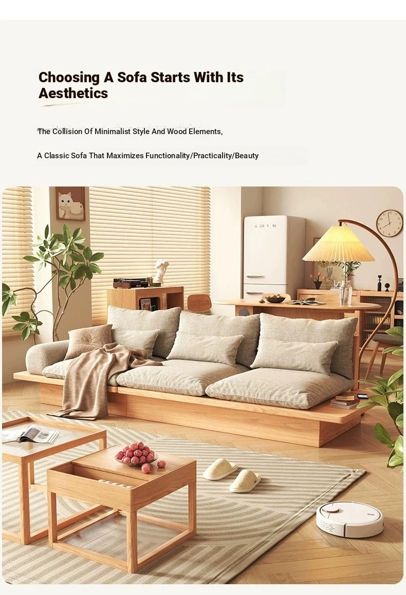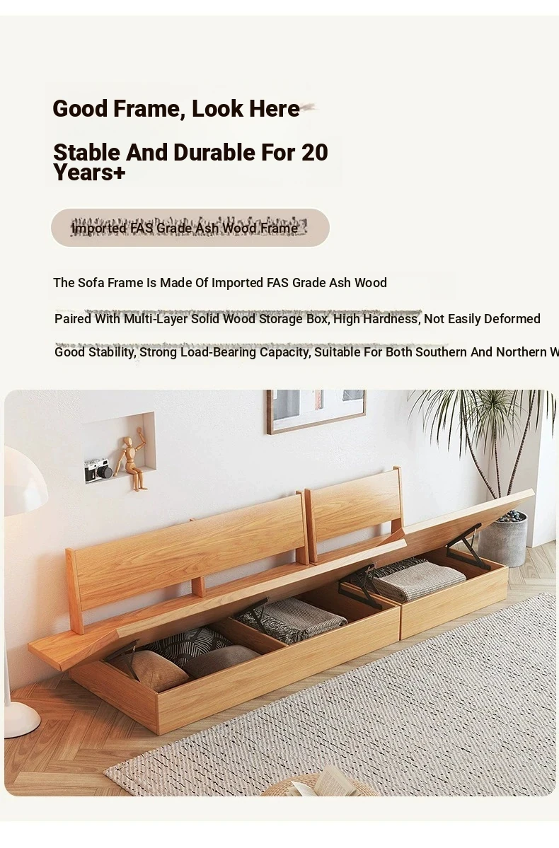 Japanese Style Solid Wood Large Board Minimalist Modern Three-Seater Sofa with Storage for Small Living Rooms, Upholstered Tatami Sofa