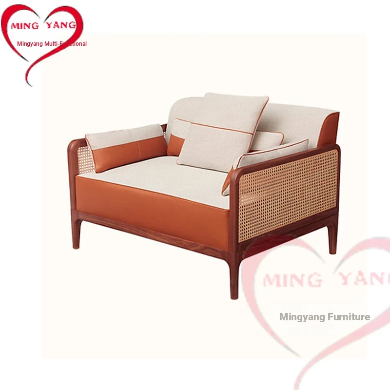 Nordic Style Solid Wood and Fabric Leisure Sofa – Modern Minimalist Designer Sofa for Hotels and Showrooms, Perfect for Singles and Couples, with Elegant Rattan Accents