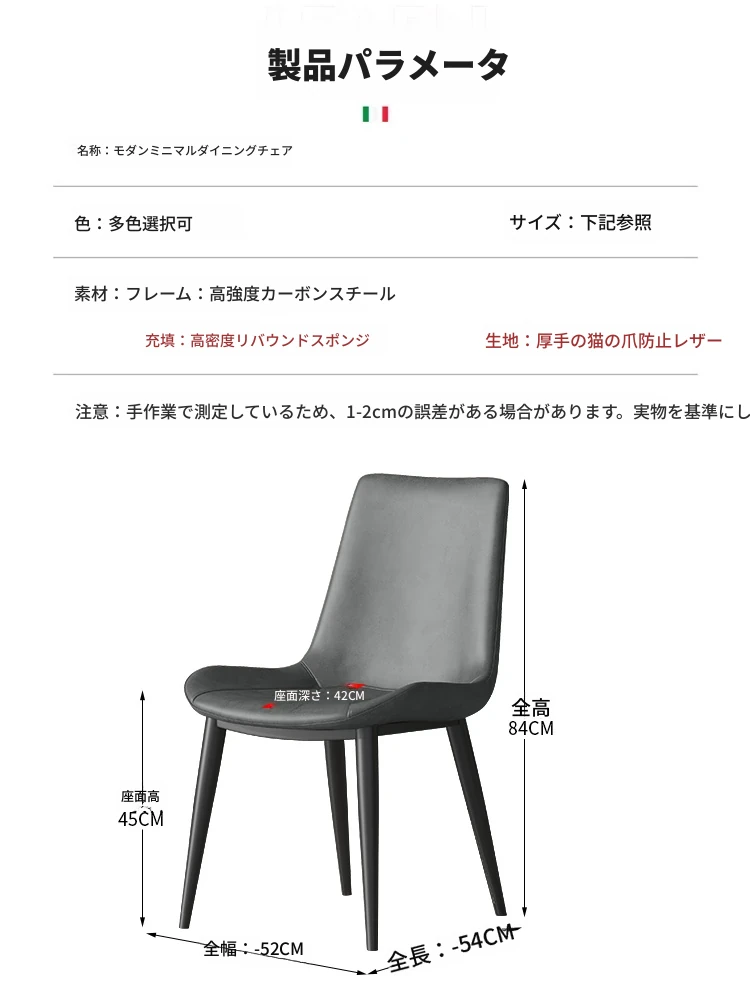 広東省佛山産のイタリアンスタイル高級感あふれる軽奢華ダイニングチェア!猫の爪にも強い耐久性、モダンでミニマルなデザイン。家庭用に最適、優雅な食卓にぴったりの一品です。
