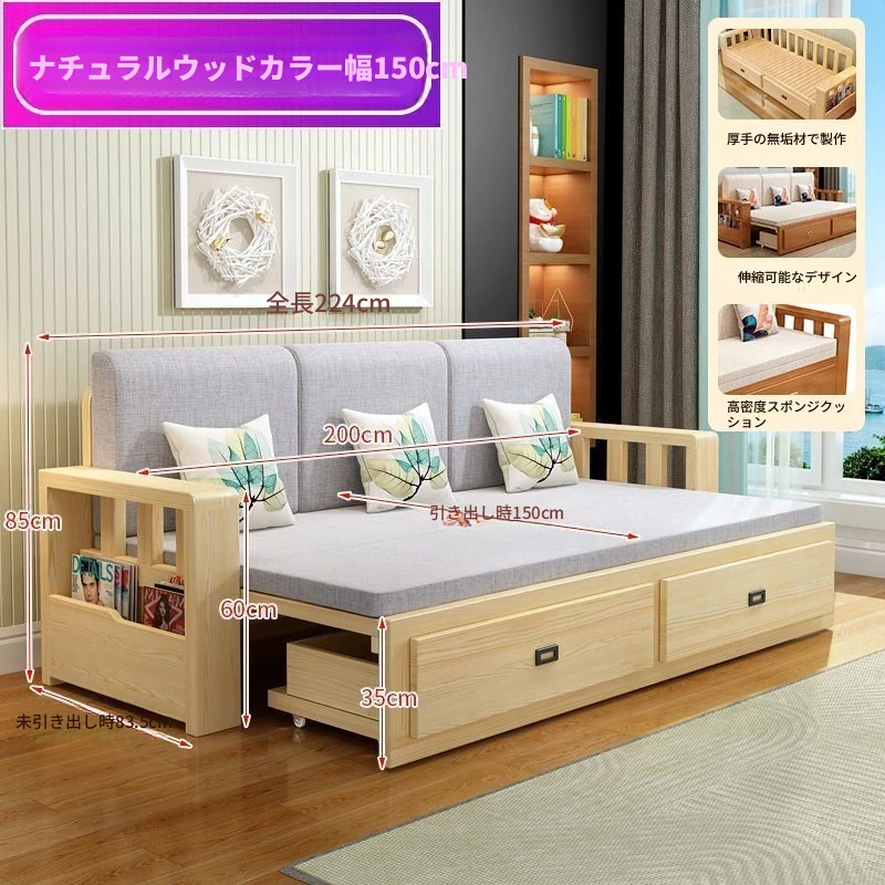 1.5X2.24メートル【伸縮可能+多機能】無料設置/ナチュラルタイプ【無垢材ソファベッド】+洗えるマットレス+複数の豪華ギフト