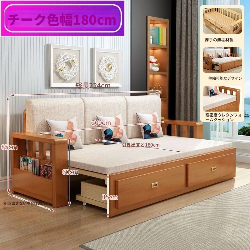 1.8X2.24メートル【伸縮可能+多機能】無料設置/ナチュラルタイプ【無垢材ソファベッド】+洗えるマットレス+複数の豪華ギフト