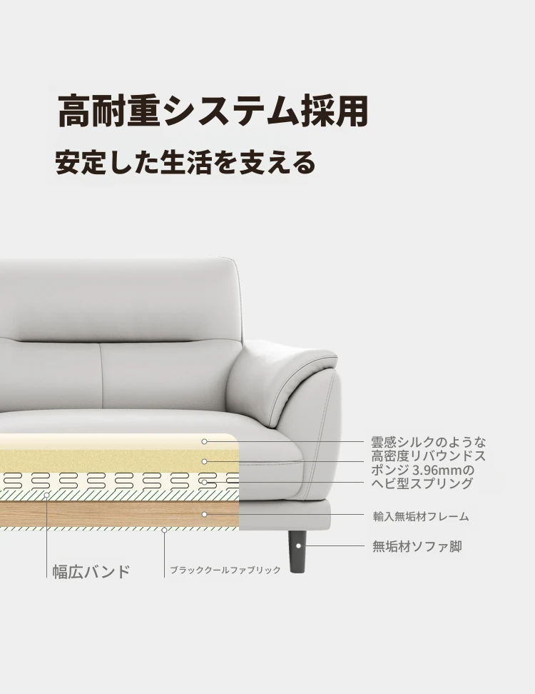 期間限定特価-【エコ牛皮≈1.8mm】(三人位1.9米)45D高反発ウレタン+無垢木フレーム イタリアングレー