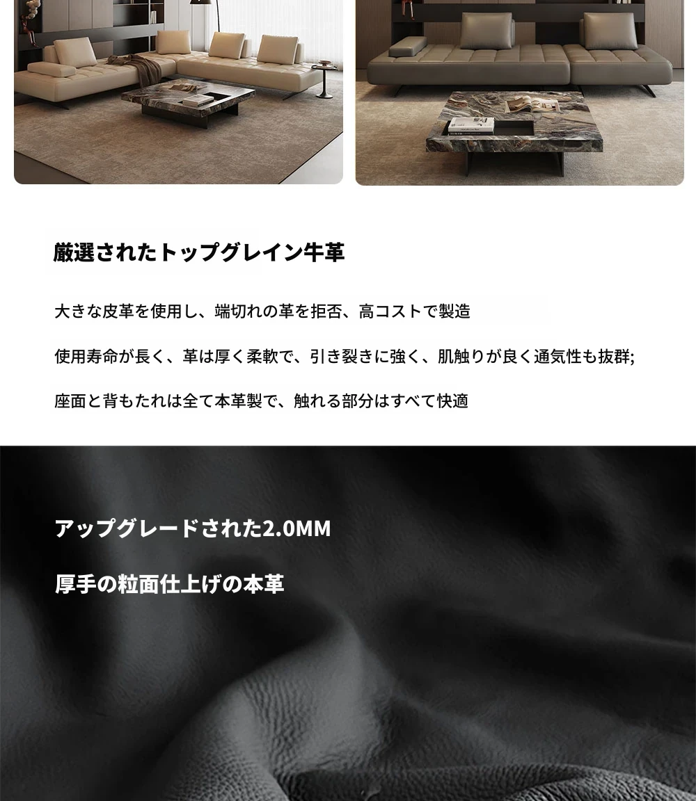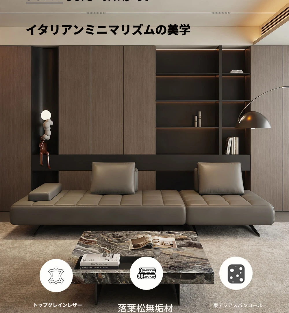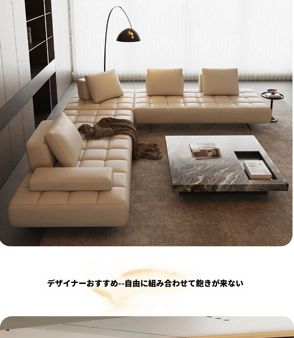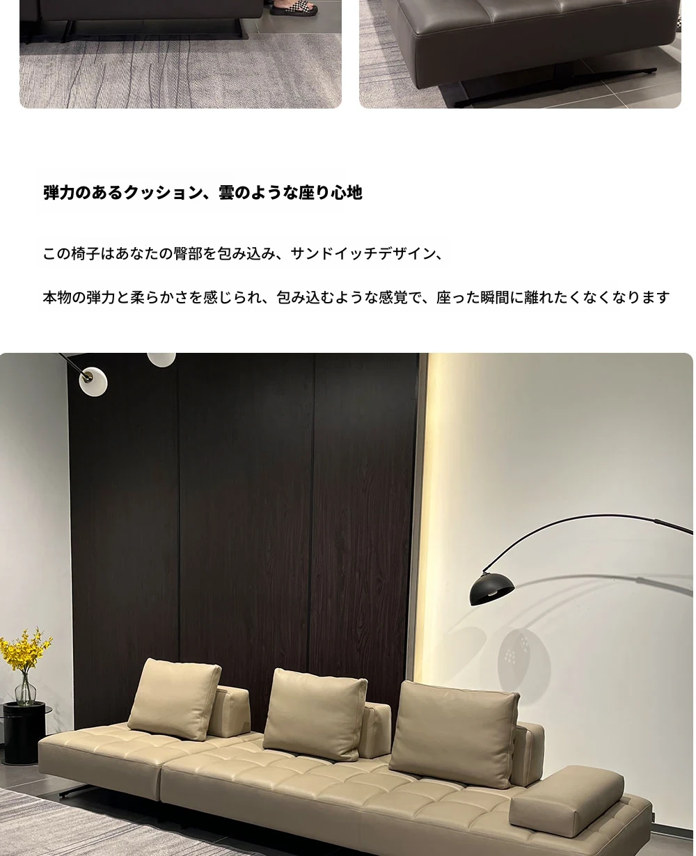 イタリアンミニマル・メビウス本革ソファ - ラグジュアリーな大平層別荘に最適!モジュール式で自由自在に配置可能、移動可能な背もたれで快適さを追求。あなたのリビングに洗練されたスタイルを。