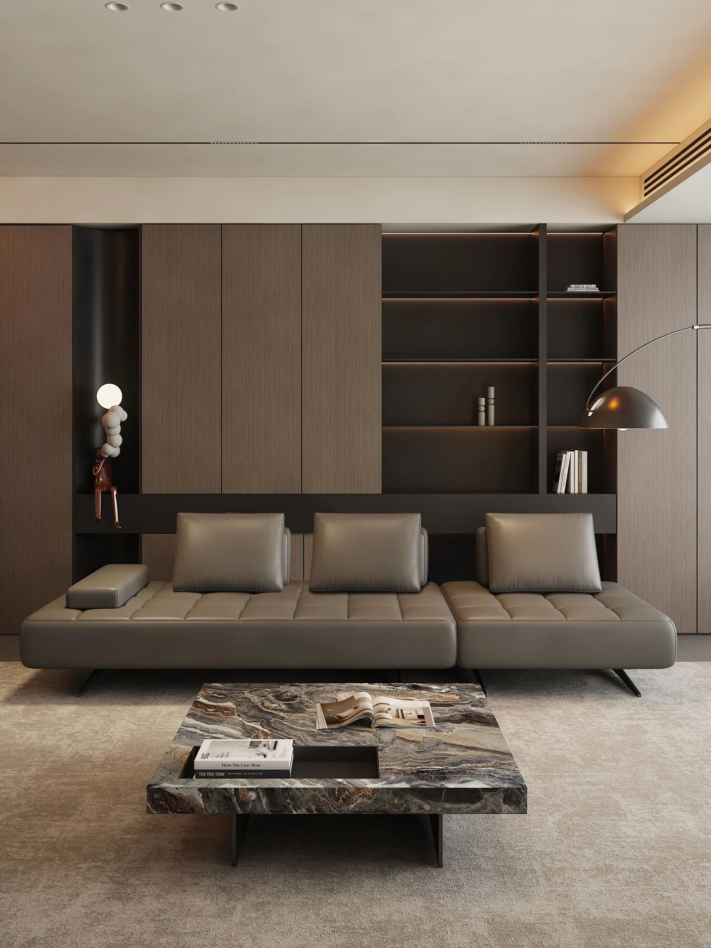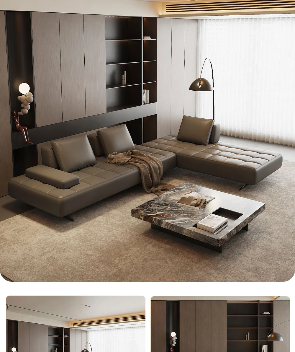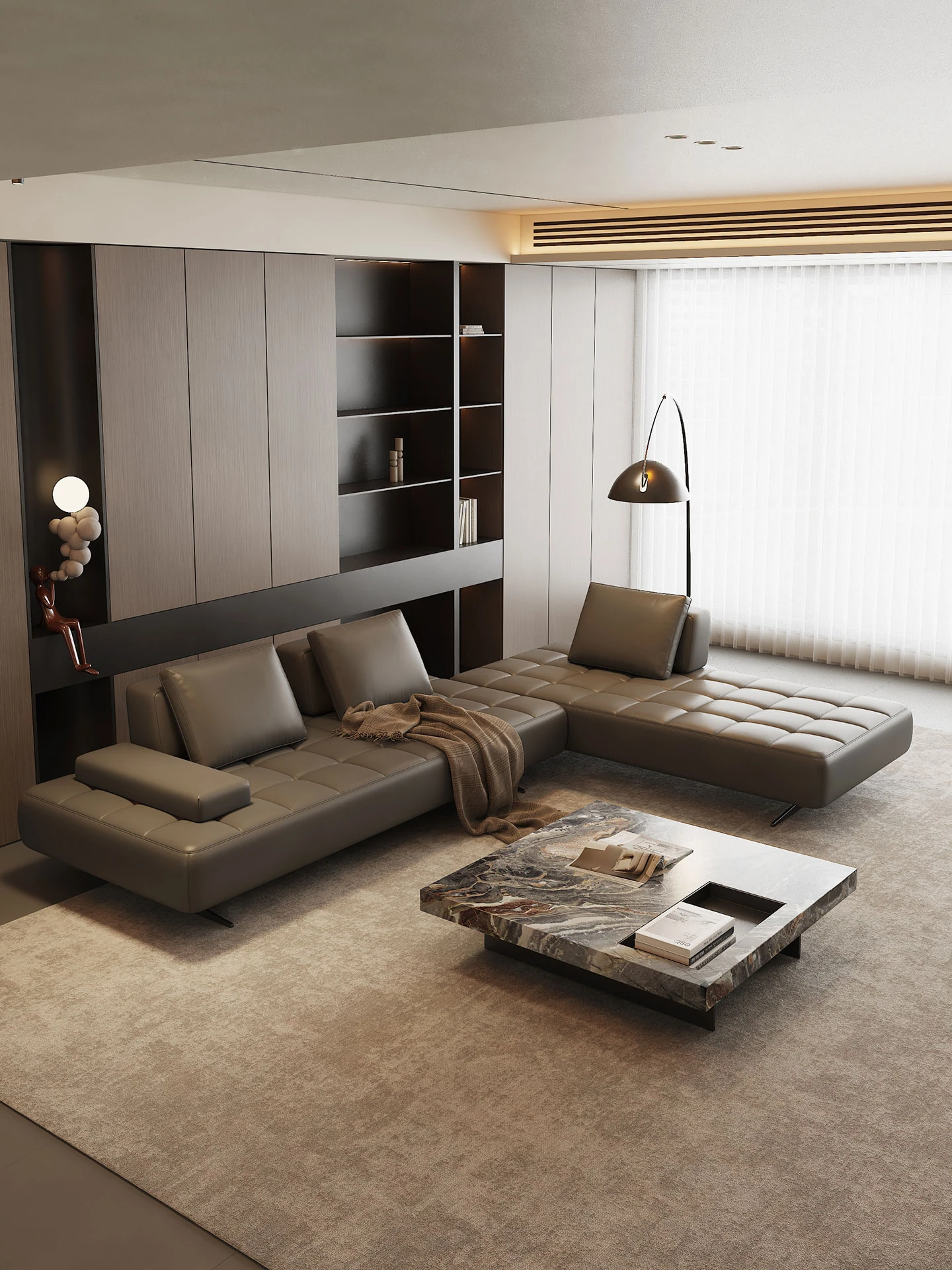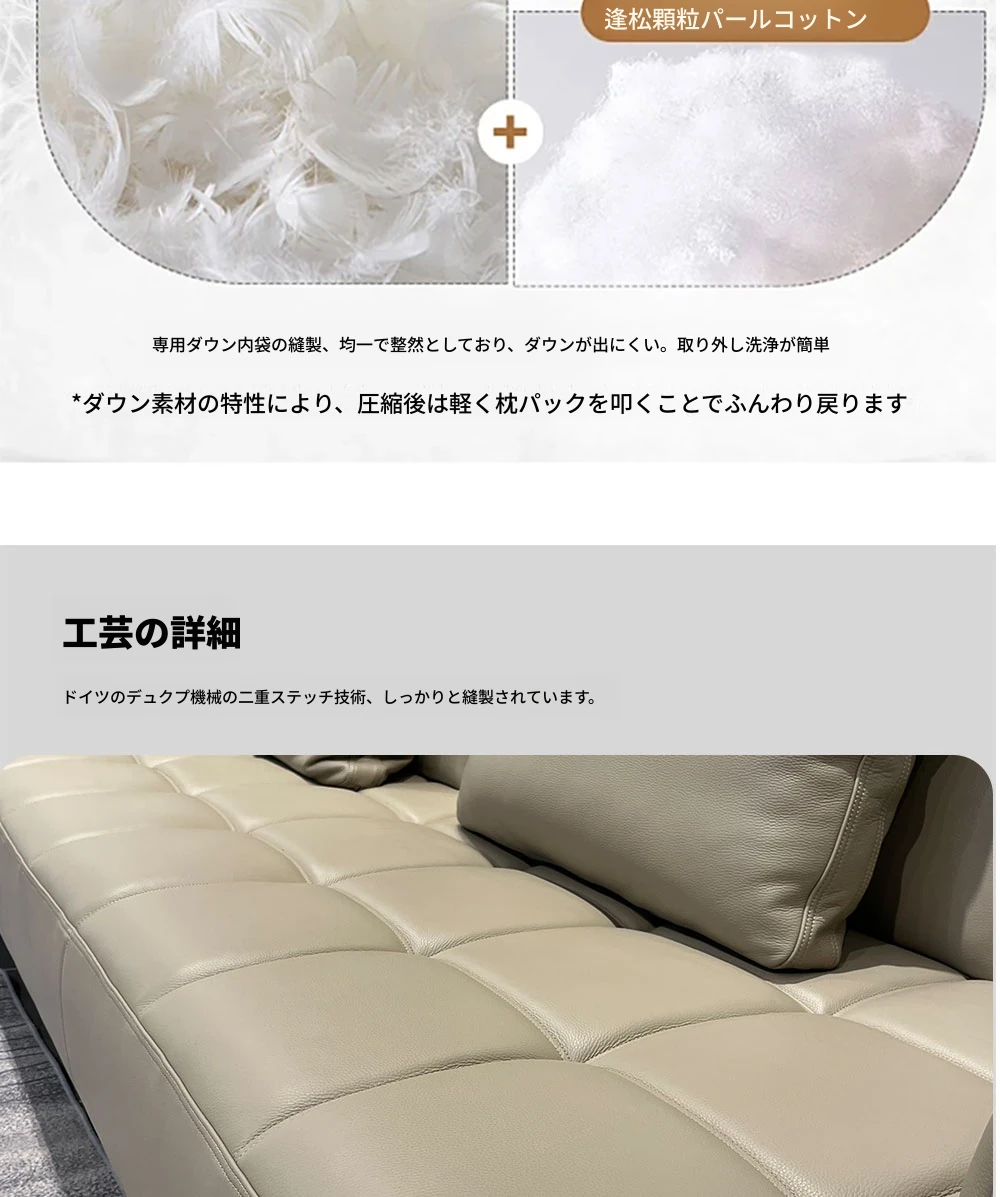 イタリアンミニマル・メビウス本革ソファ - ラグジュアリーな大平層別荘に最適!モジュール式で自由自在に配置可能、移動可能な背もたれで快適さを追求。あなたのリビングに洗練されたスタイルを。