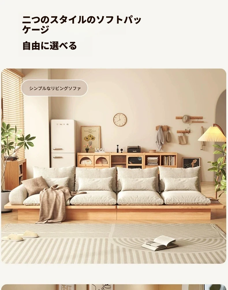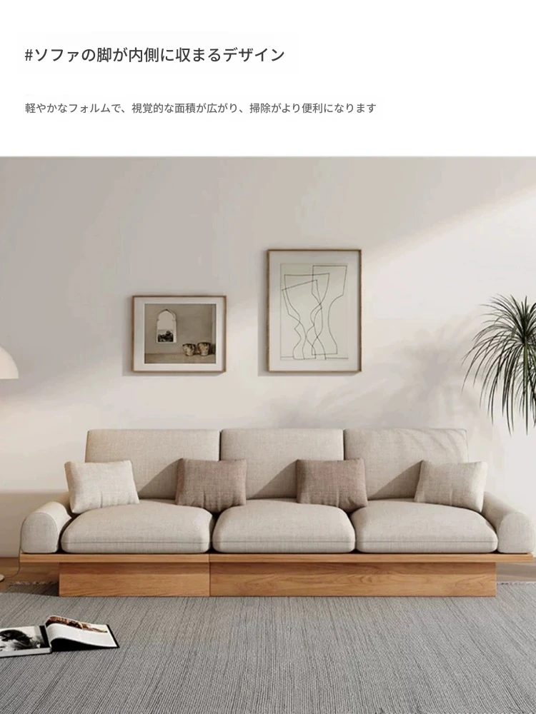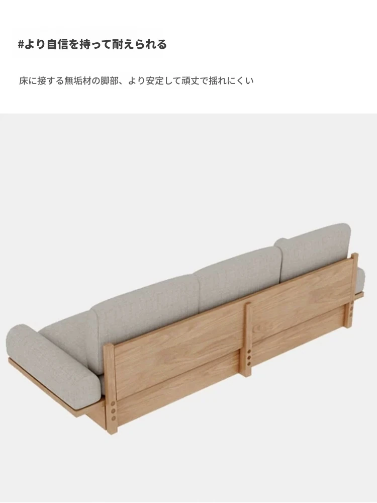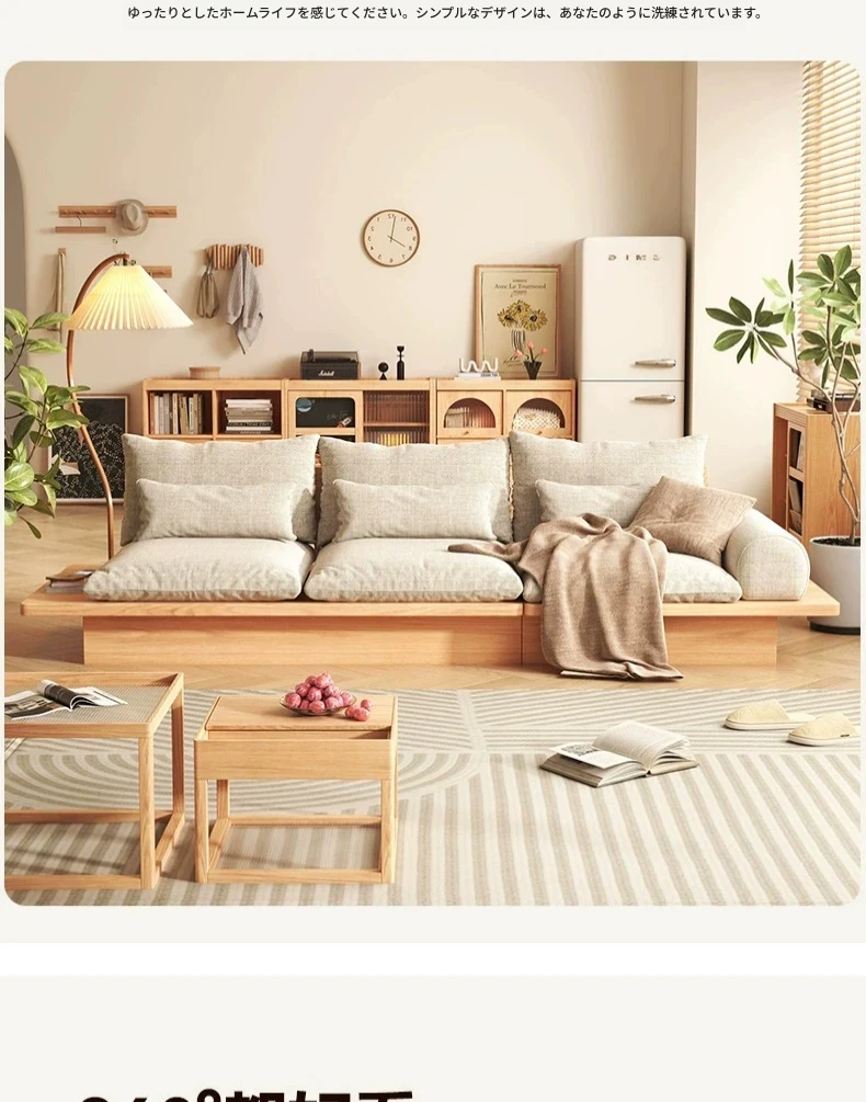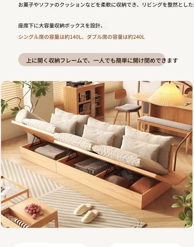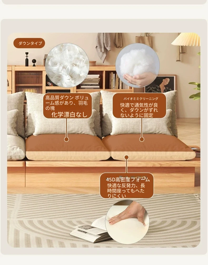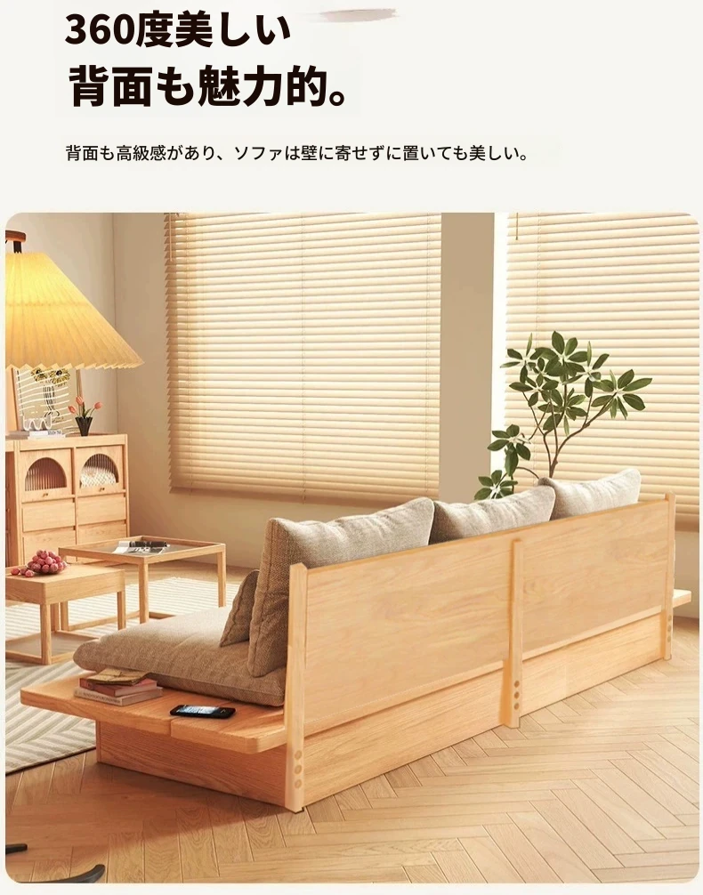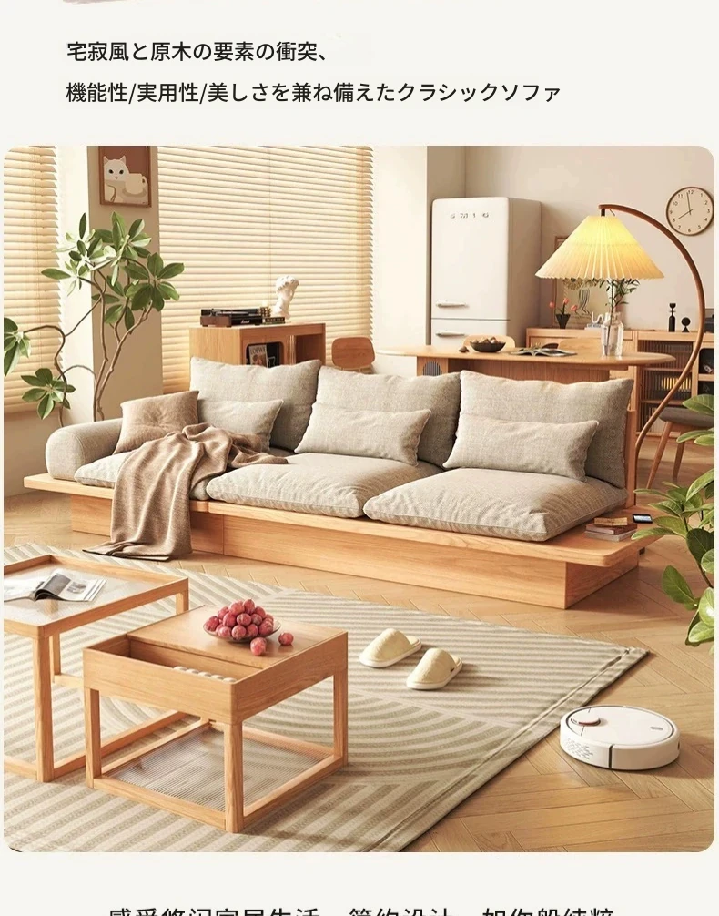 和風の無垢材リビングソファ - シンプルでモダンな小型スペース向け、収納機能付きの侘寂スタイル・フロアソファ。心地よい木の温もりで、あなたのリビングをスタイリッシュに演出します。