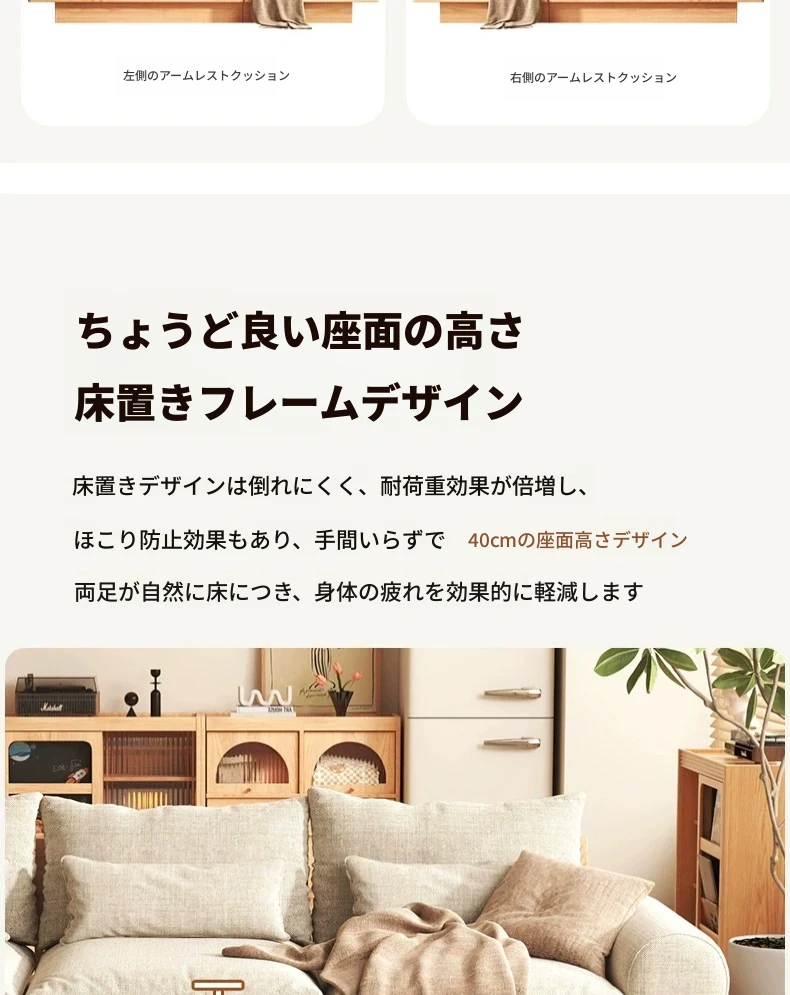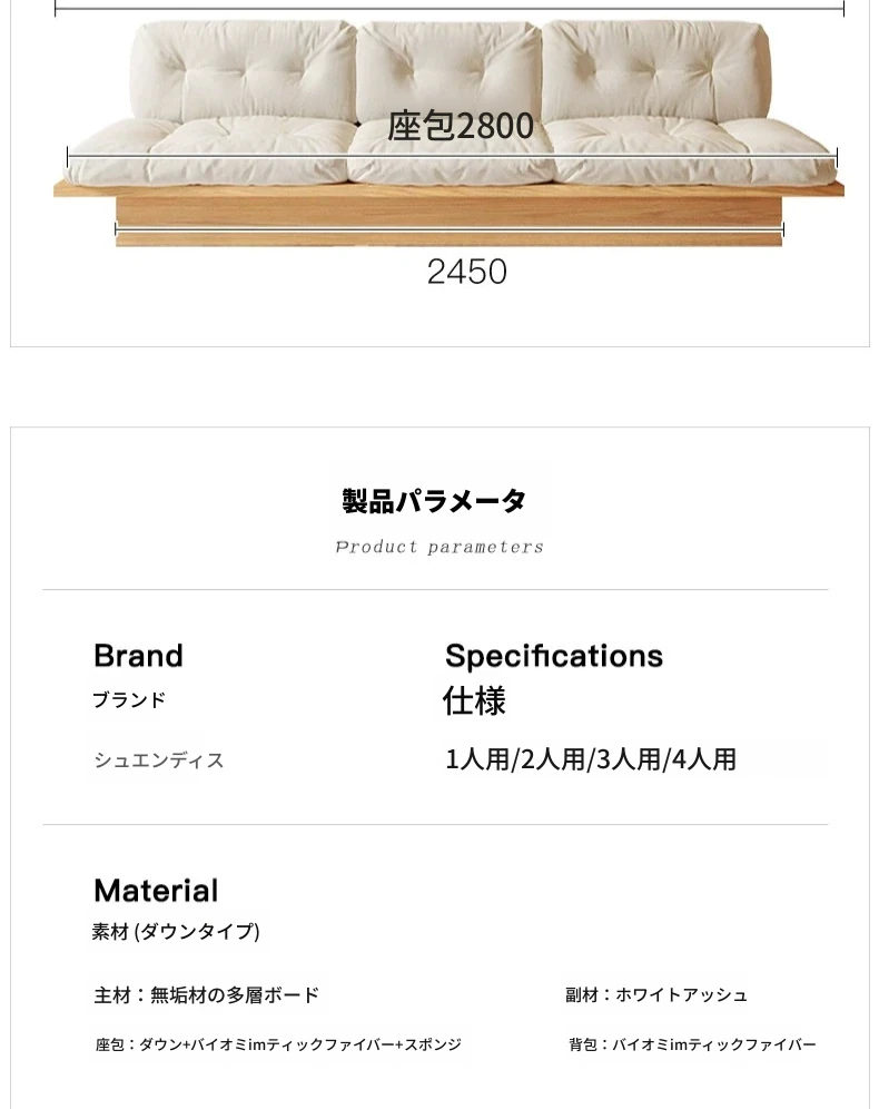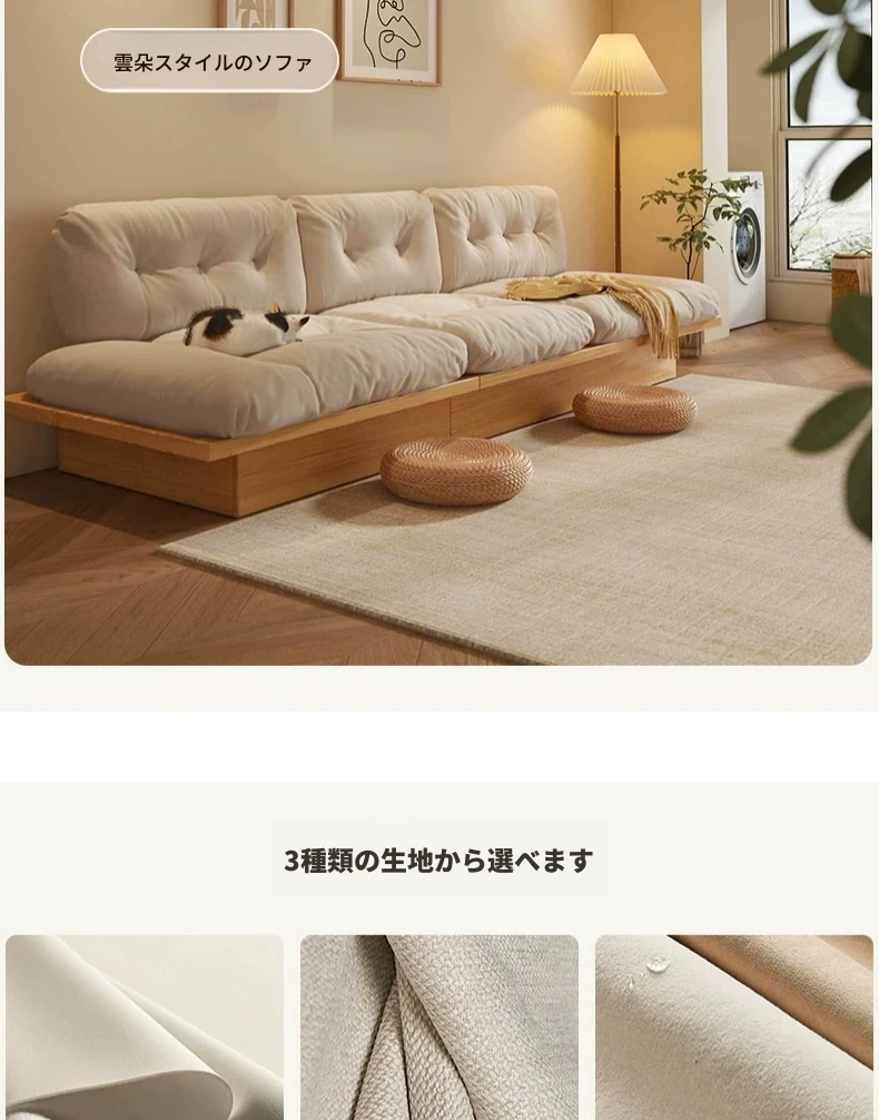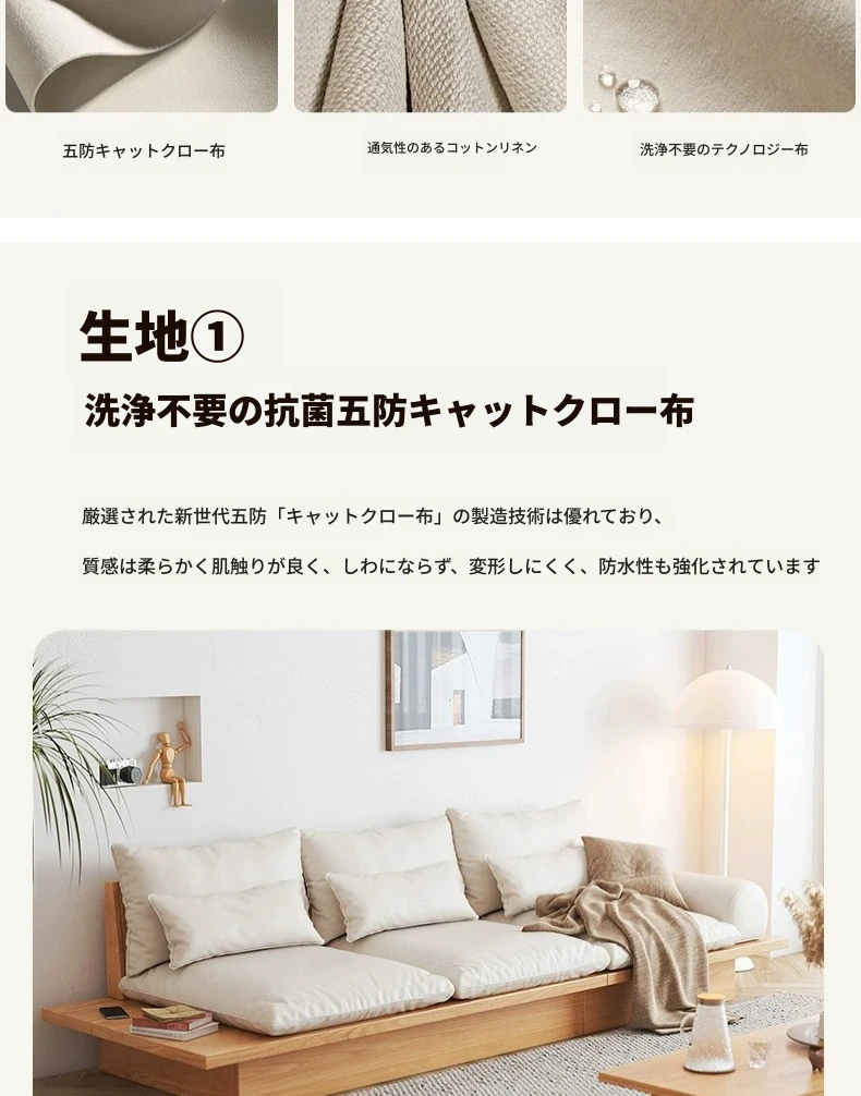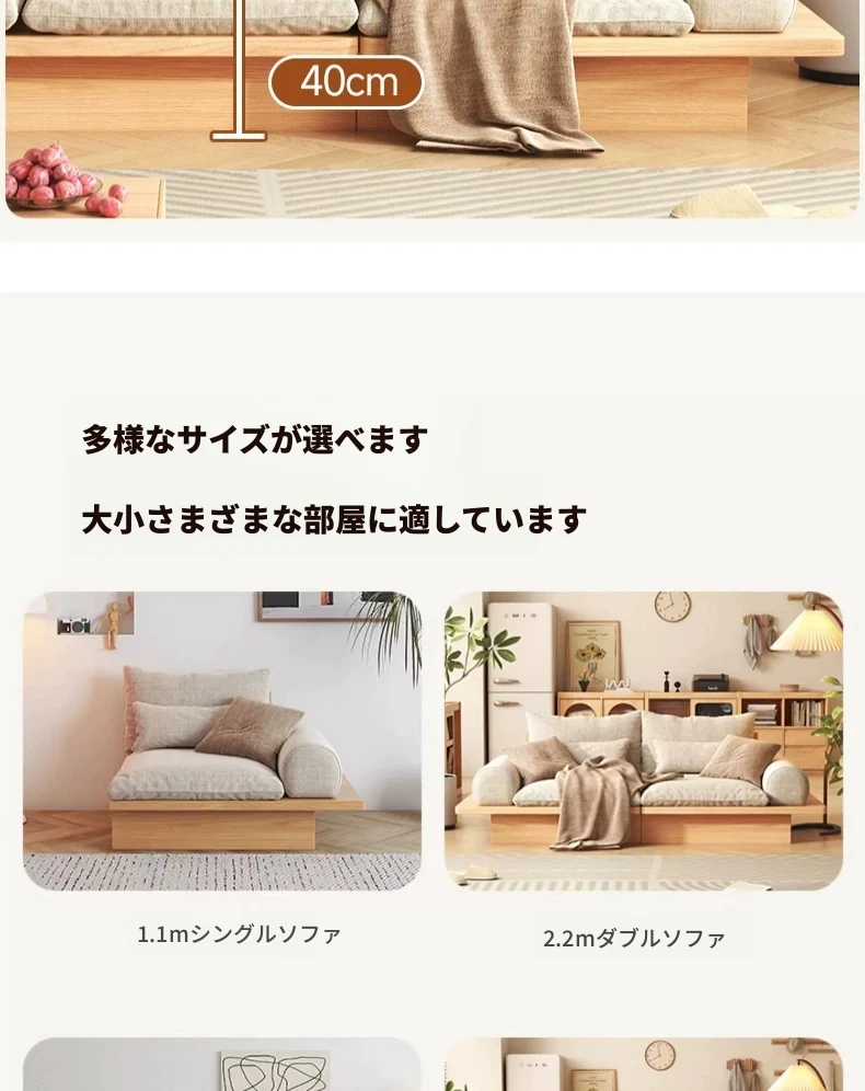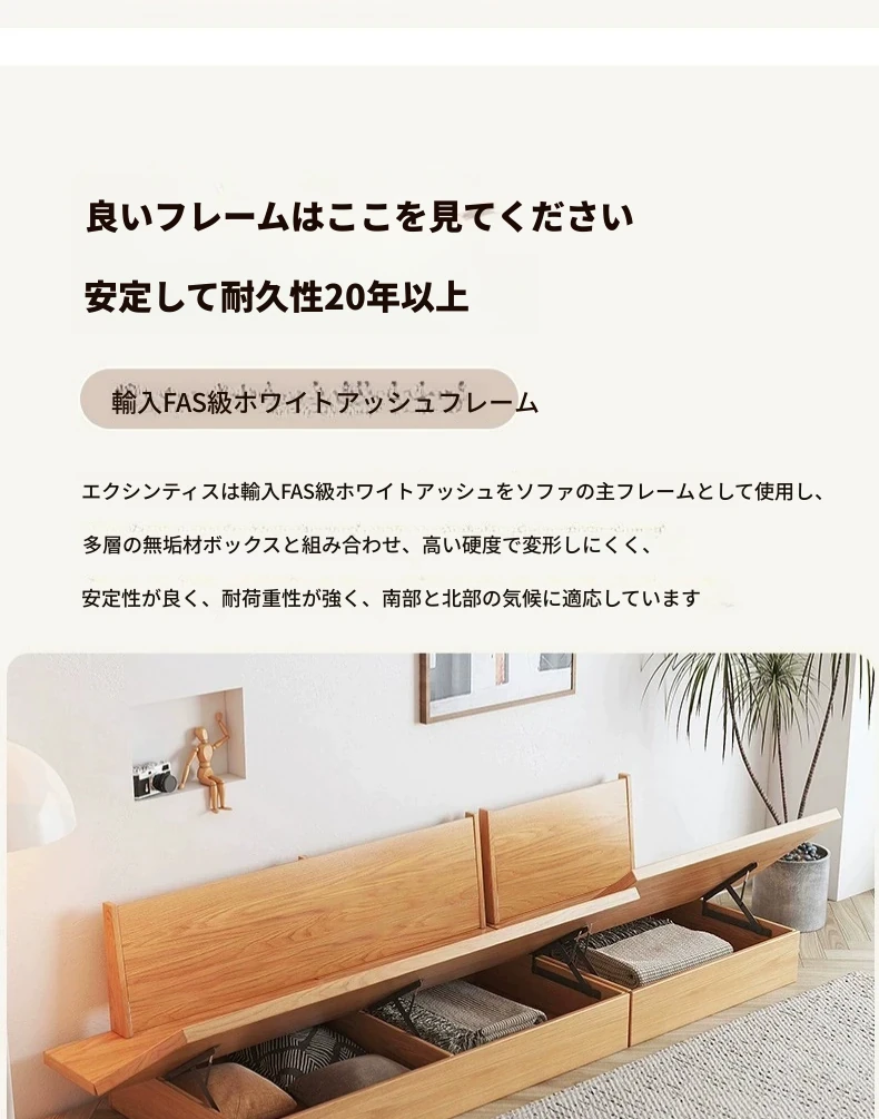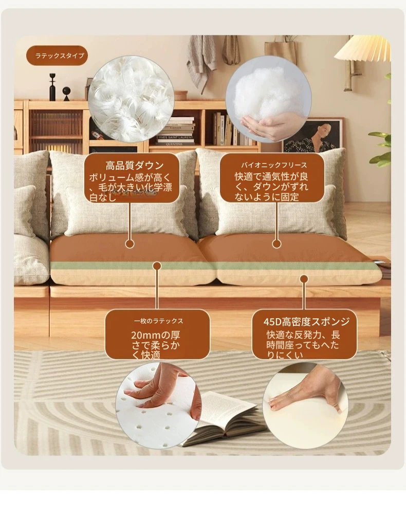 和風の無垢材リビングソファ - シンプルでモダンな小型スペース向け、収納機能付きの侘寂スタイル・フロアソファ。心地よい木の温もりで、あなたのリビングをスタイリッシュに演出します。