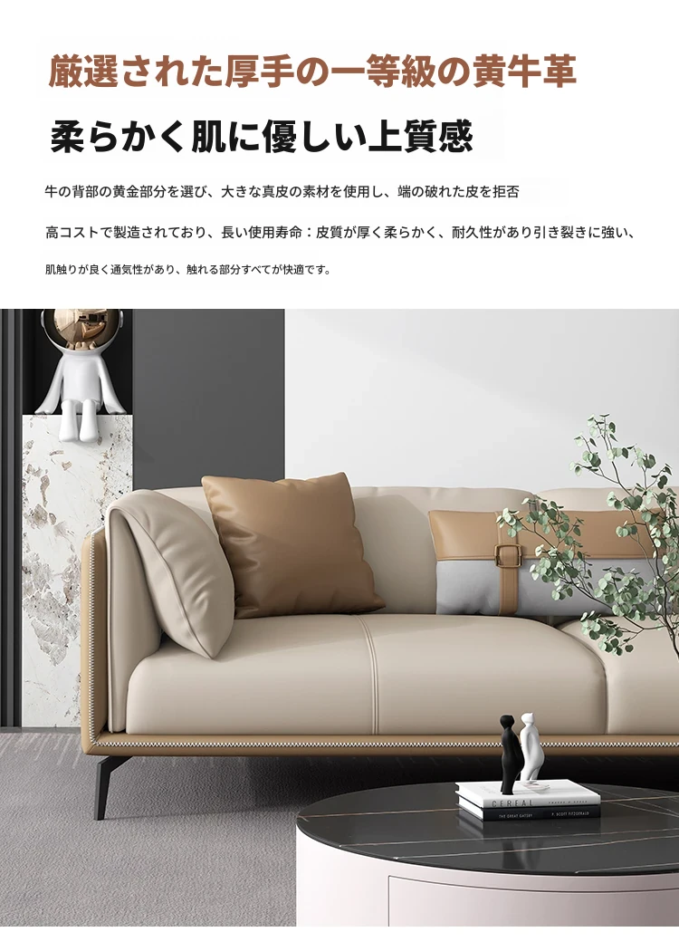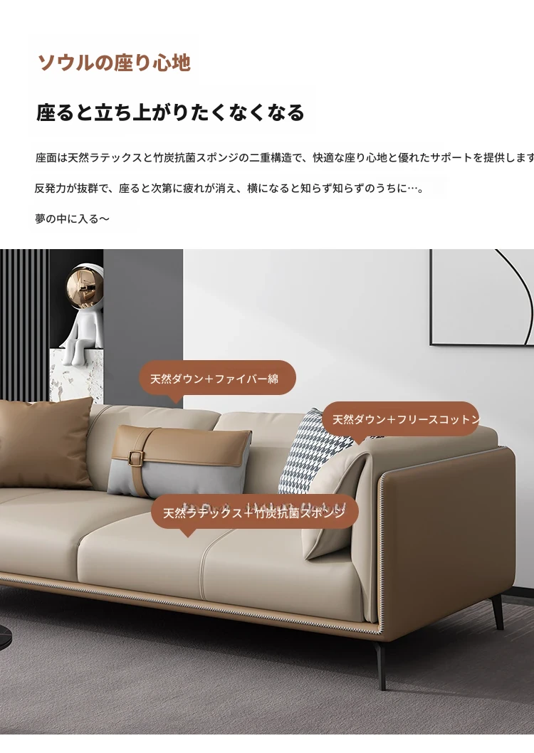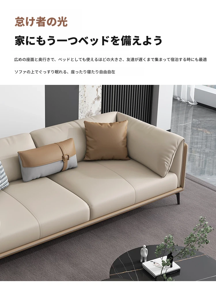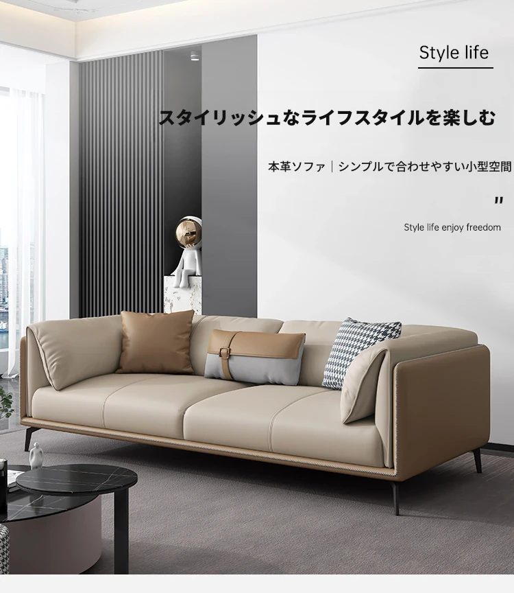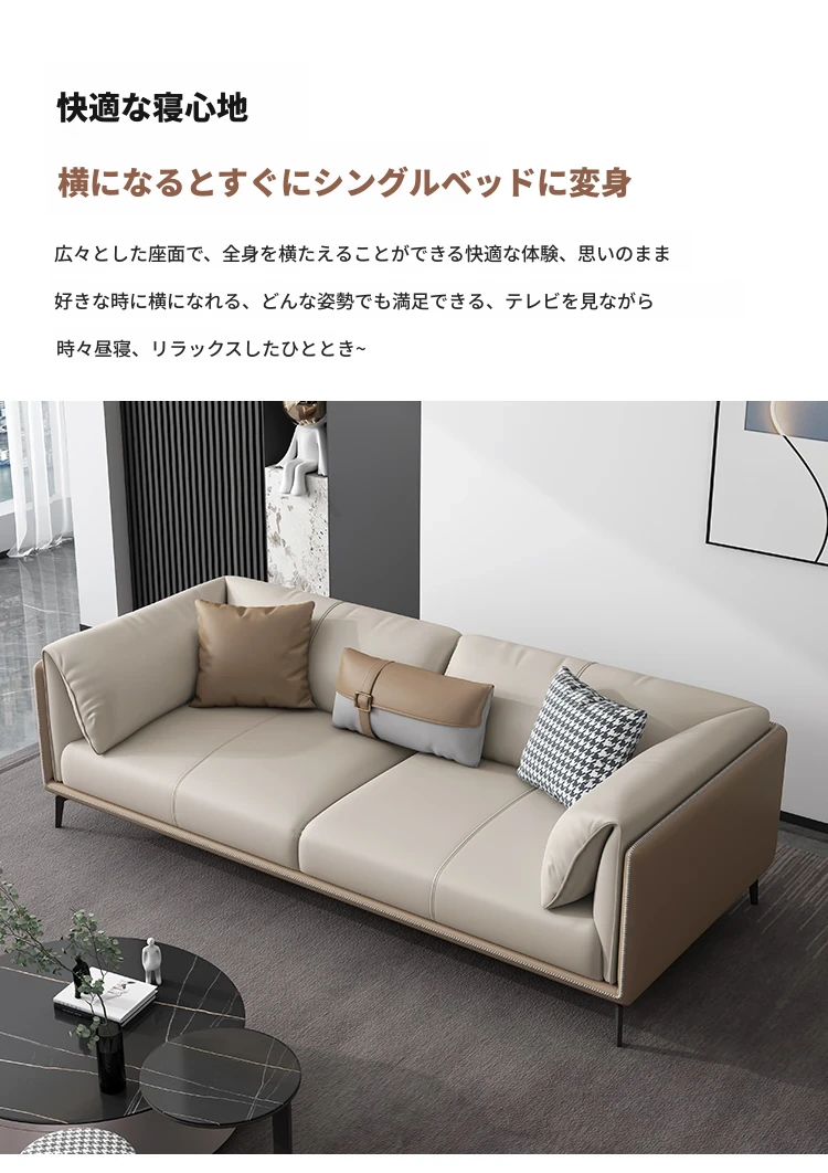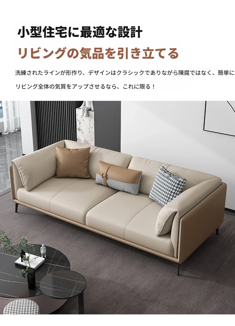 見葉イタリアンミニマル本革ソファ - 高級感溢れるレザー使用、コンパクトな三人掛けデザインで、小さな空間にもぴったり!ダウン入りで贅沢な座り心地を実現。