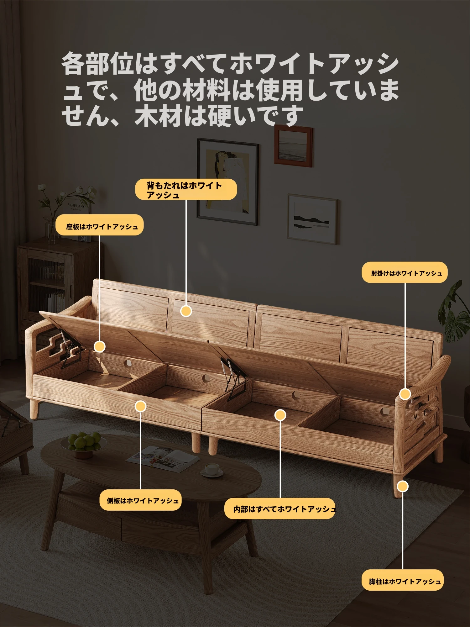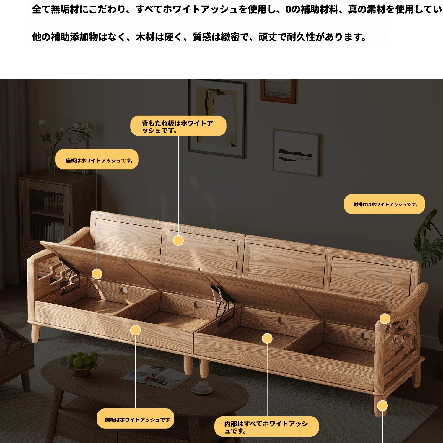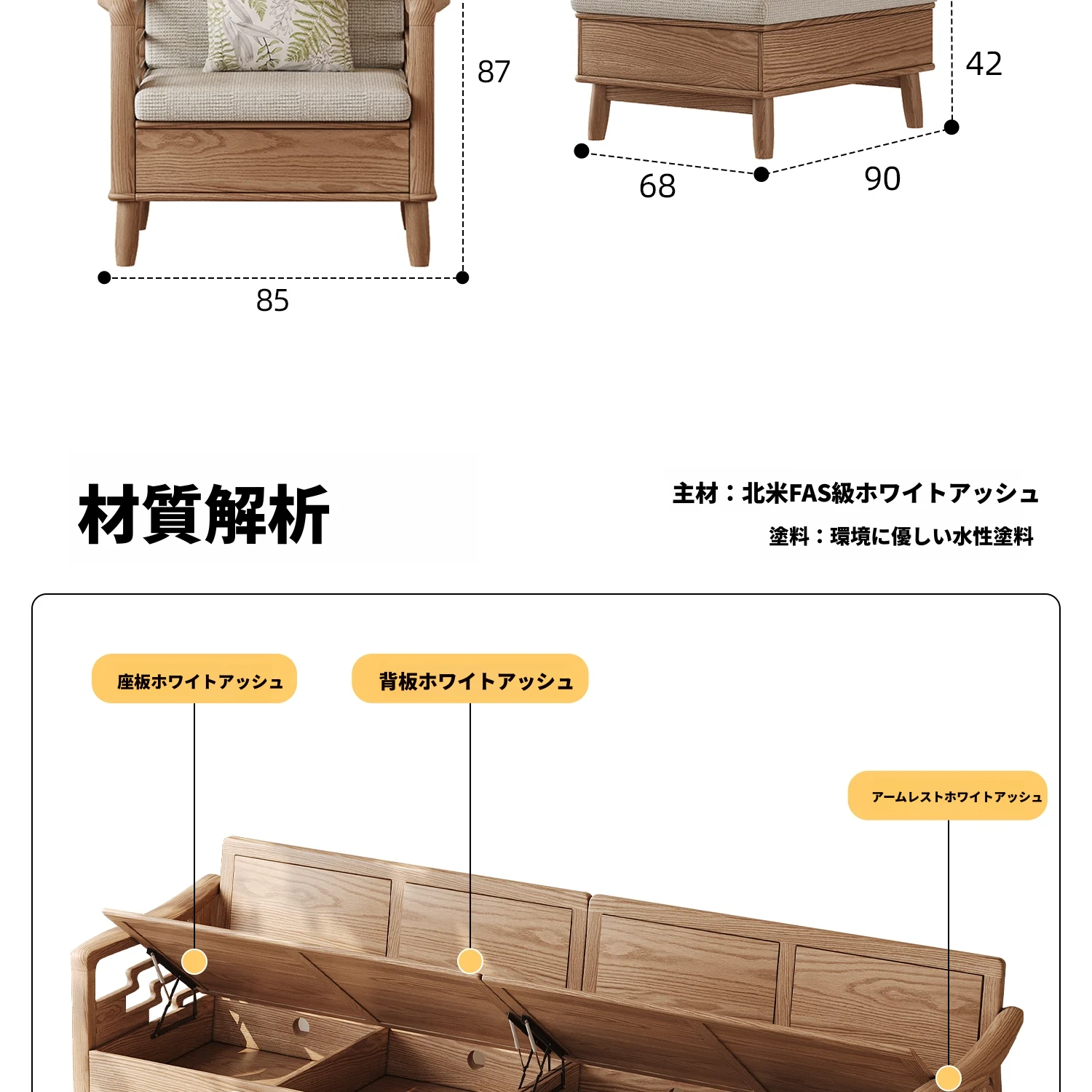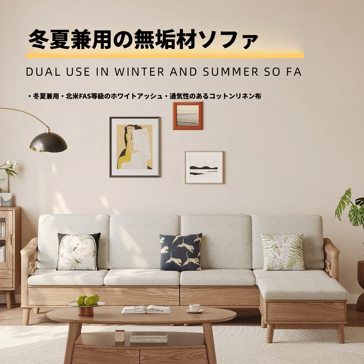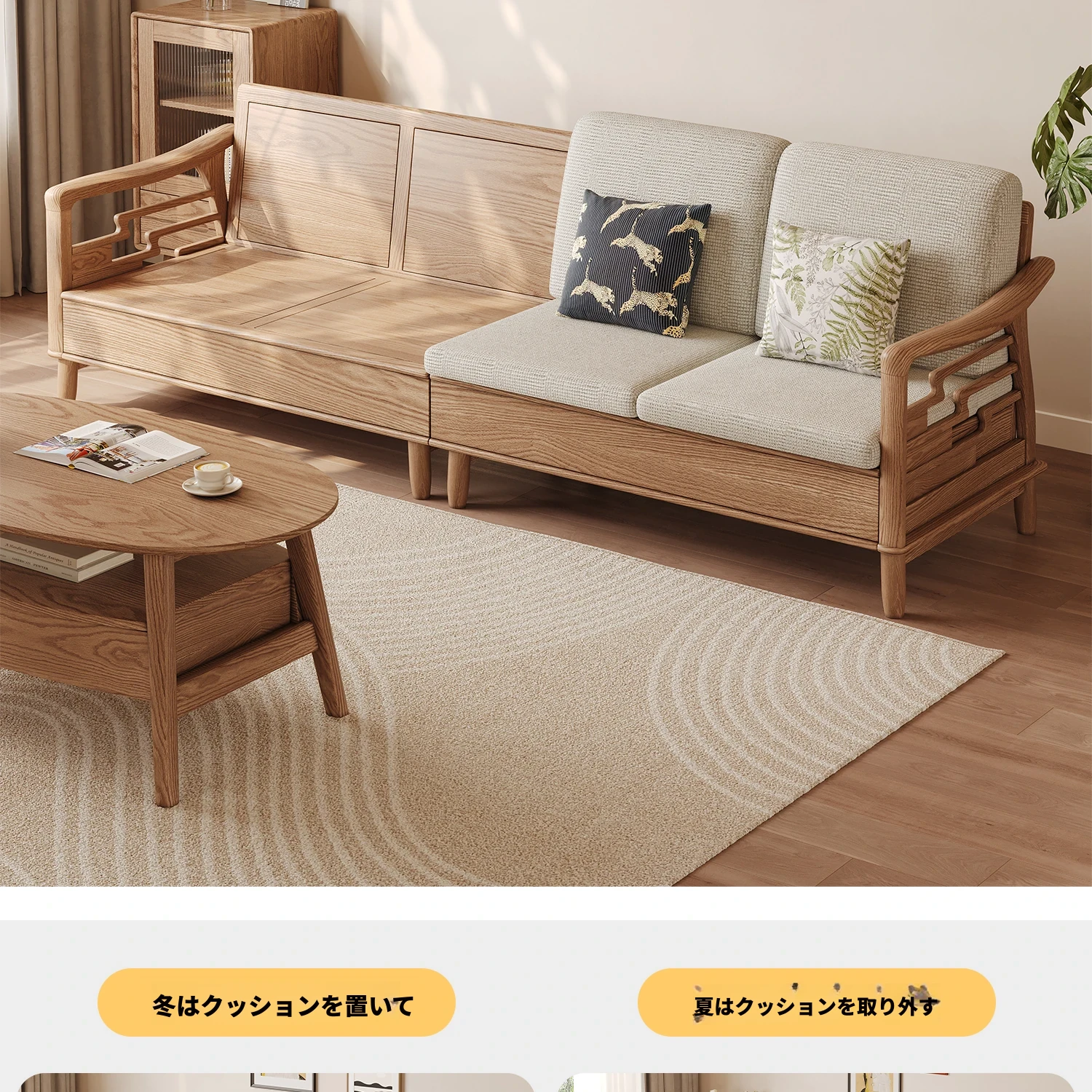 ホワイトアッシュ無垢材ソファセット|モダンミニマリストデザイン|小型リビングに最適|冬夏両用&高収納力|おしゃれで機能的な家具