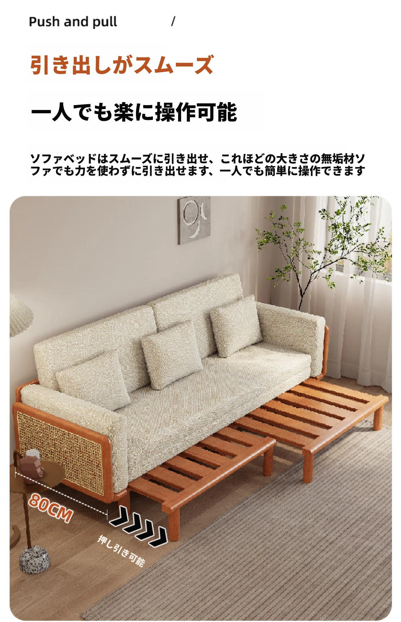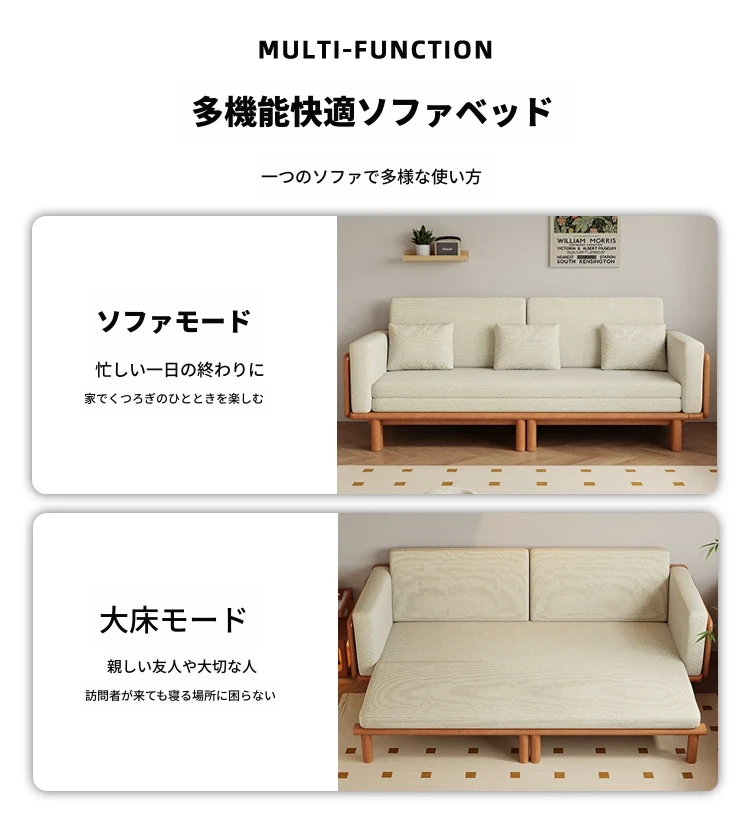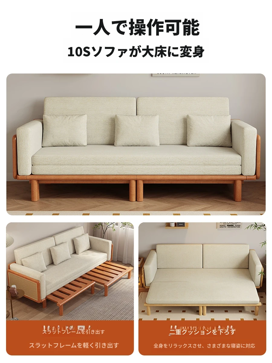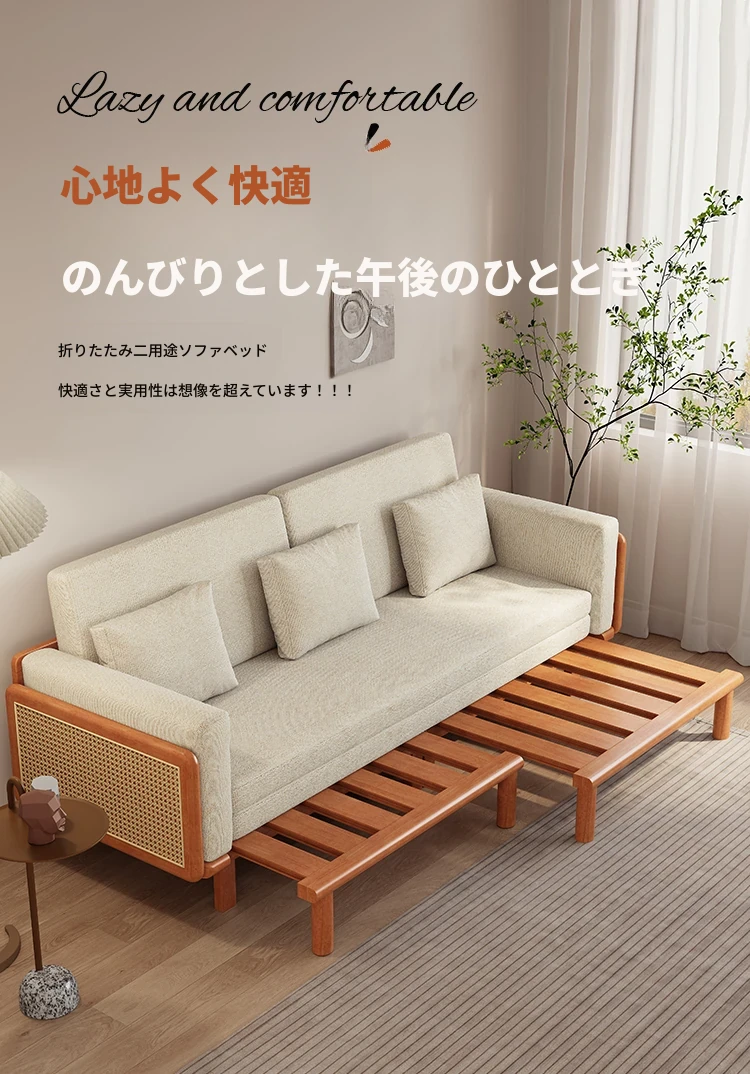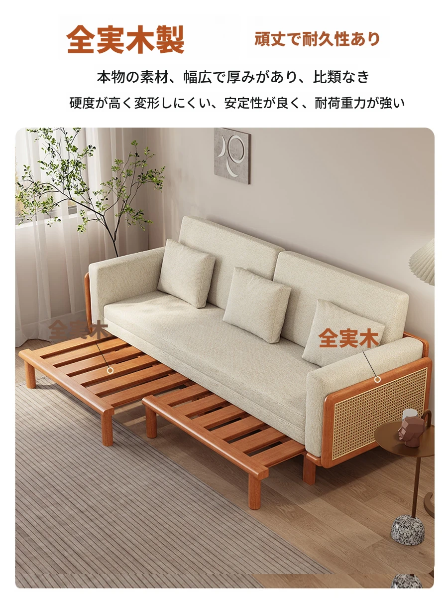 全実木のソファベッド!多機能で伸縮自在、ダブルサイズの小型リビングにぴったり。美しいチェリーホワイトカラーで、ソファとベッドを一体化。おしゃれで快適な空間を演出します!