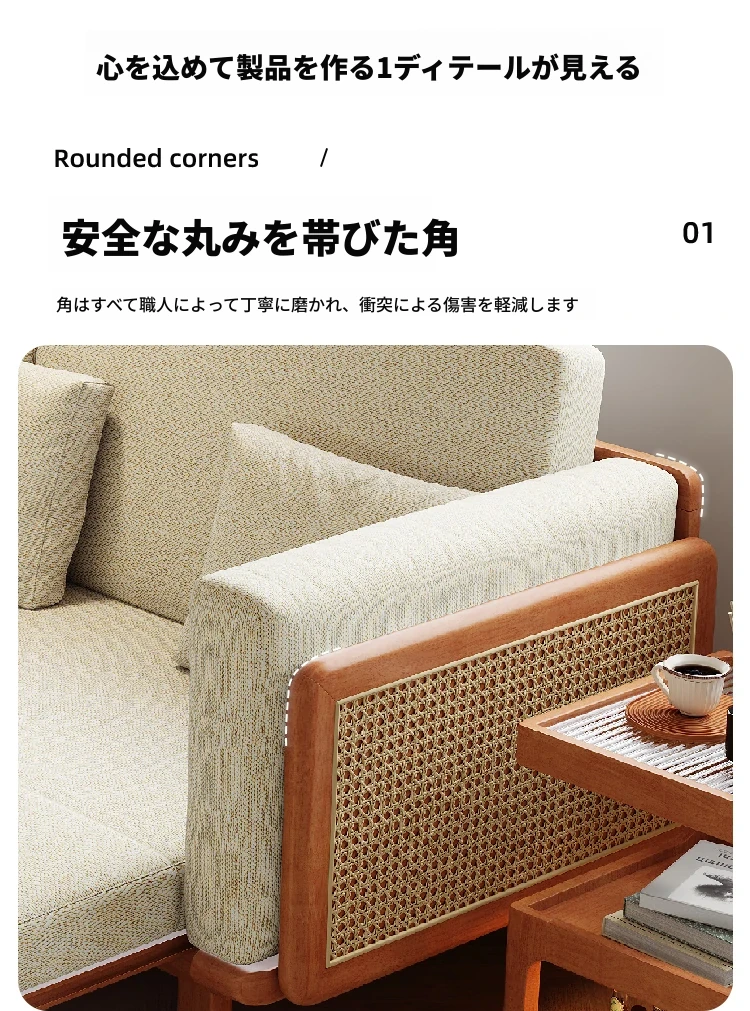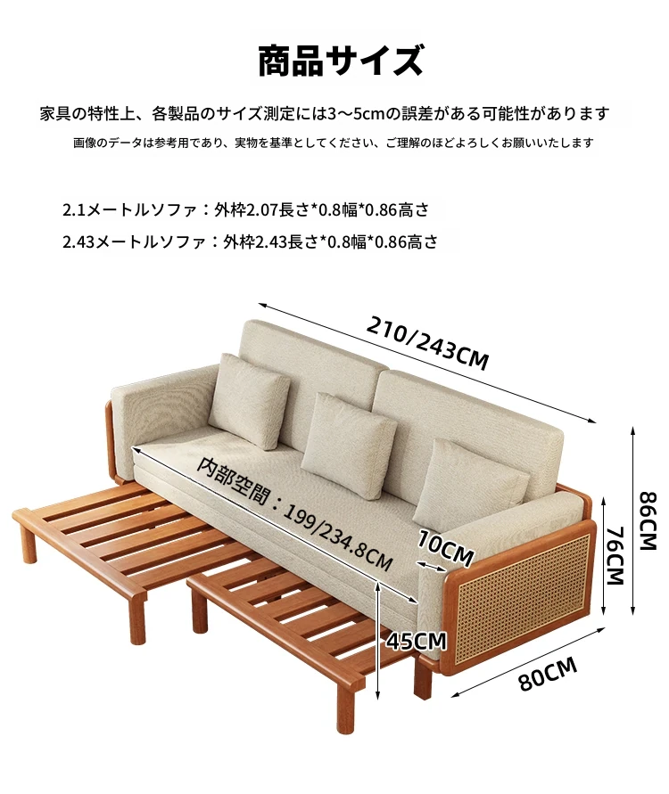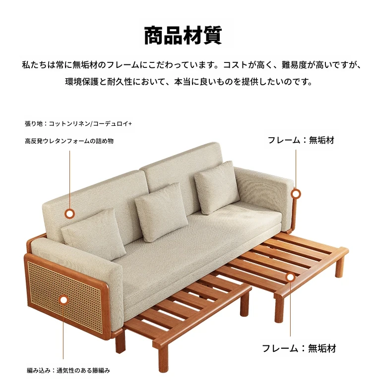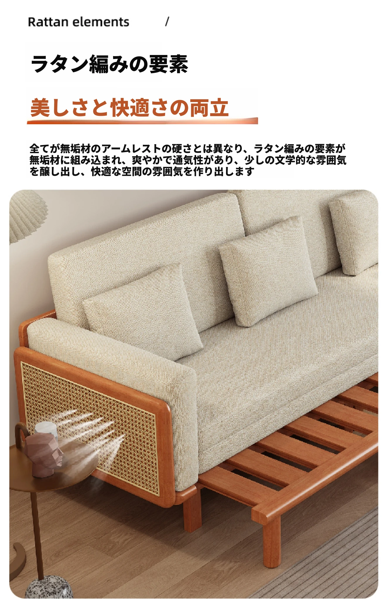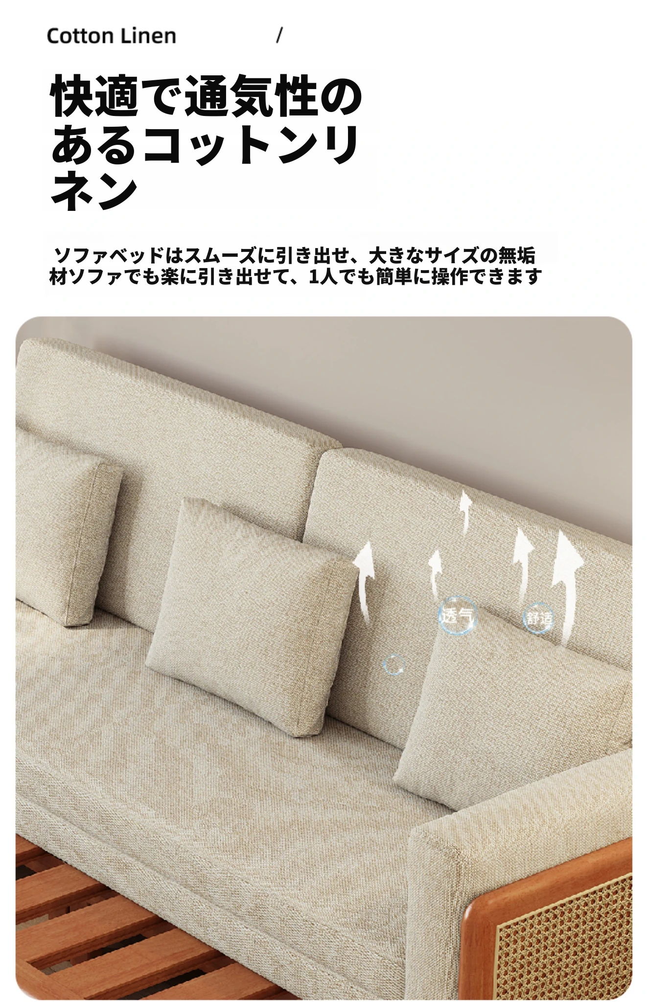 2.4メートル全無垢材ソファベッド【コットンリネンカバー+ココナッツファイバータイプクッション】【チェリーウッドカラー】