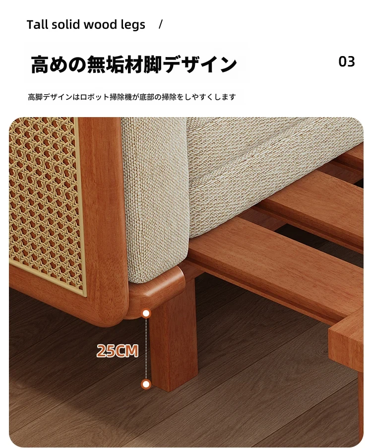 2.1メートル全無垢材ソファベッド【コットンリネンカバー+ココナッツファイバータイプクッション】【チェリーウッドカラー】