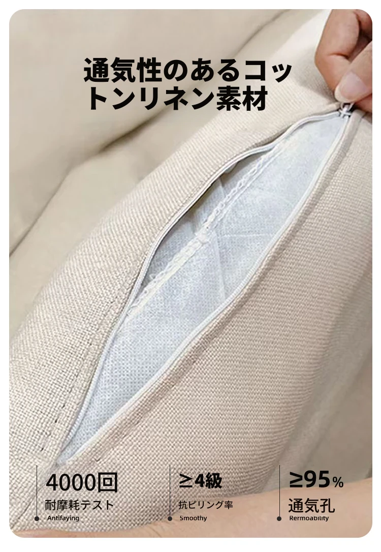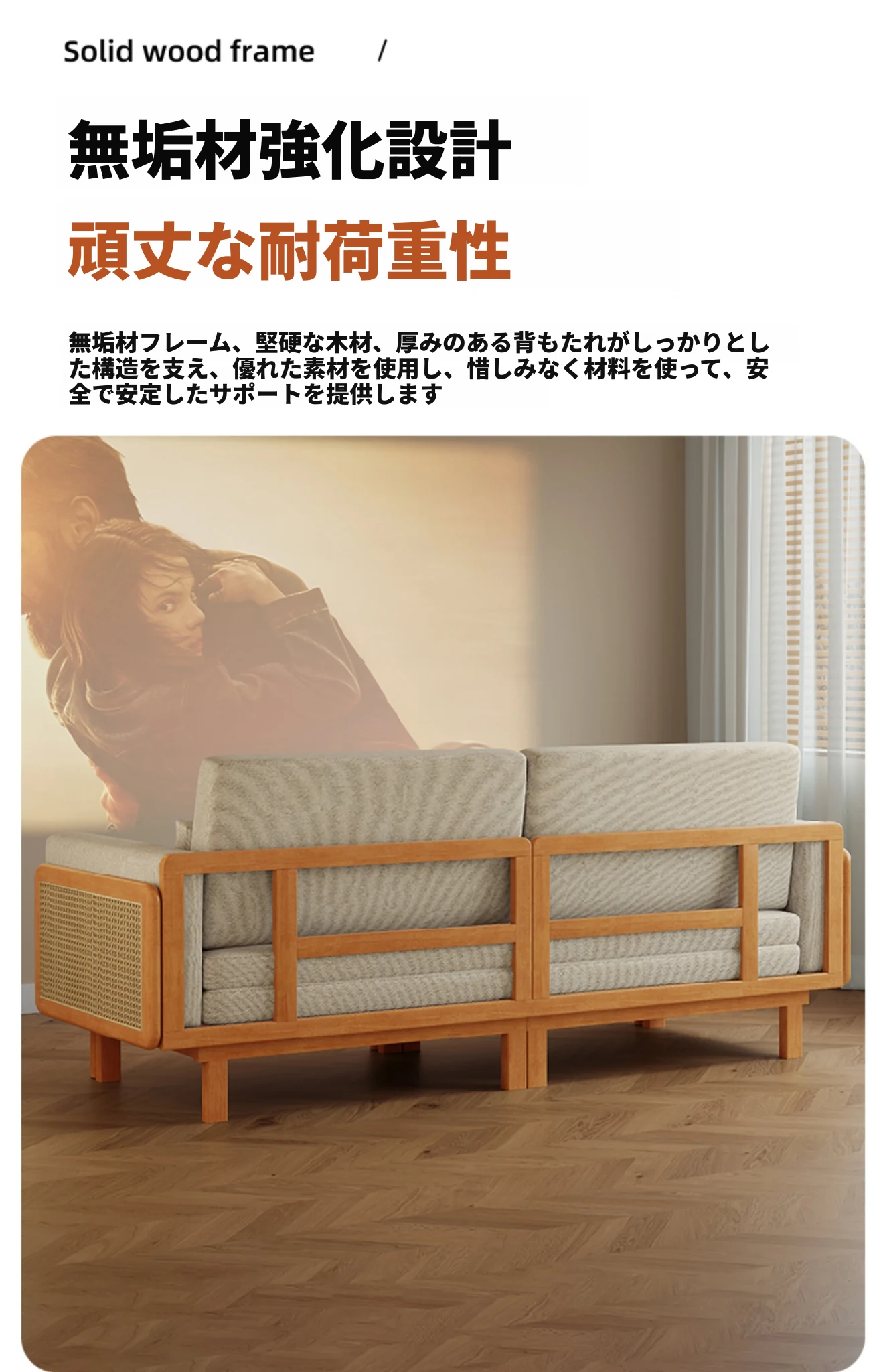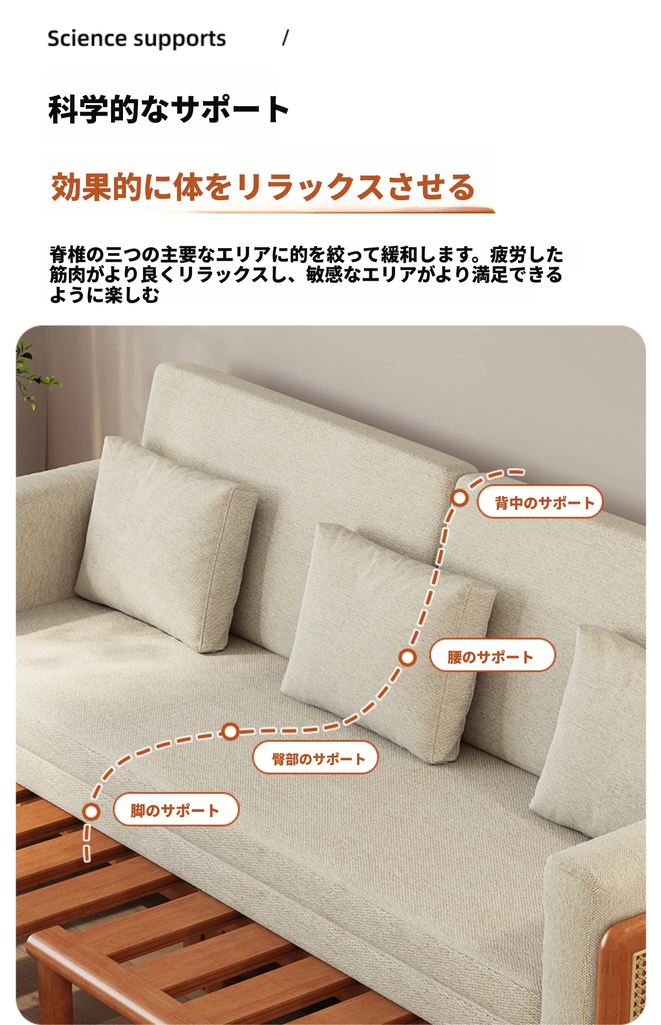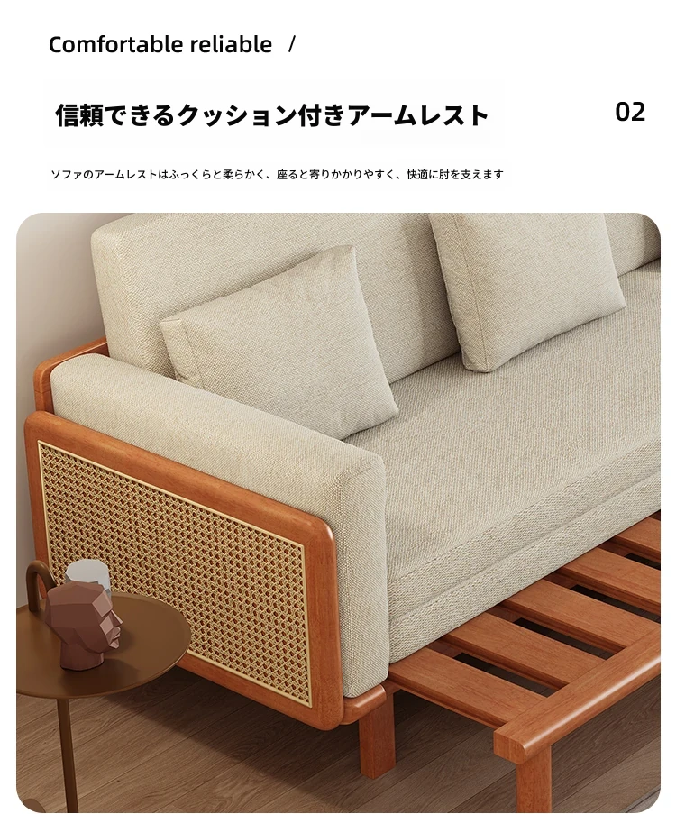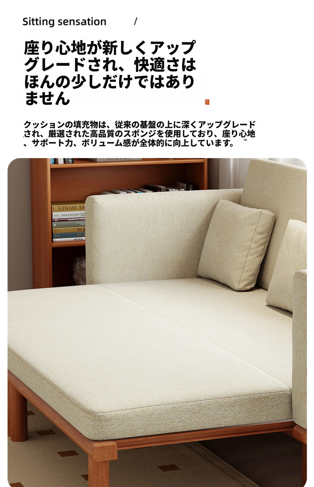 2.1メートル全無垢材ソファベッド【コットンリネンカバー+スポンジタイプクッション】【チェリーウッドカラー】