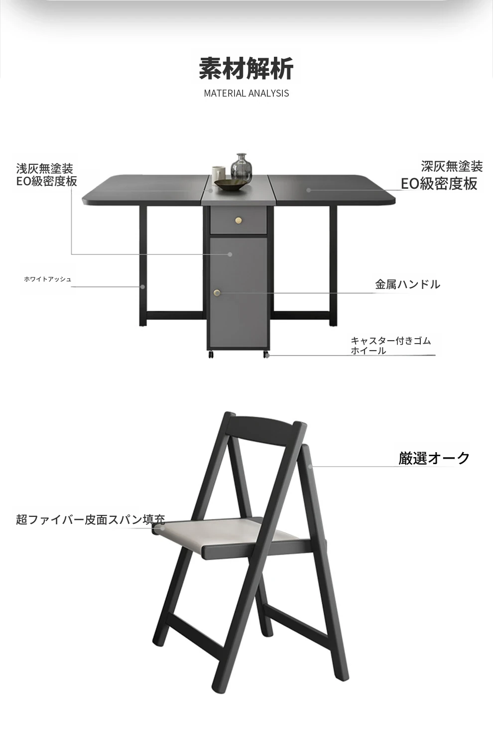 【ジェントルグレー】1.5メートル折りたたみテーブル+2脚のオークチェア【組み立て不要】
