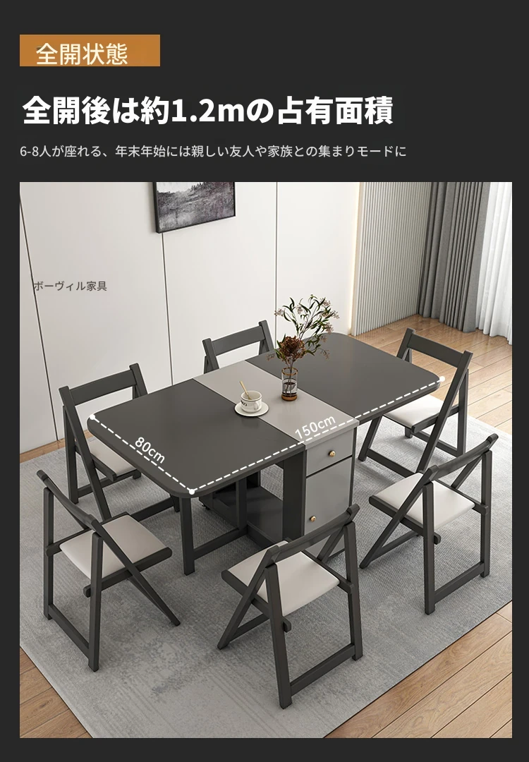 【ジェントルグレー】1.5メートル折りたたみダイニングテーブル+6脚のオークチェア