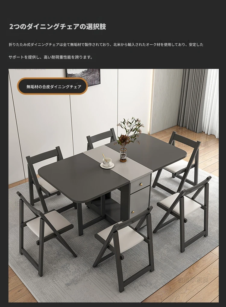 【ジェントルグレー】1.2メートル折りたたみダイニングテーブル+6脚のオークチェア