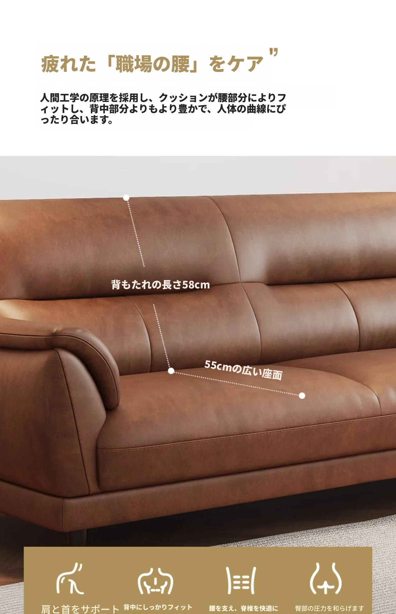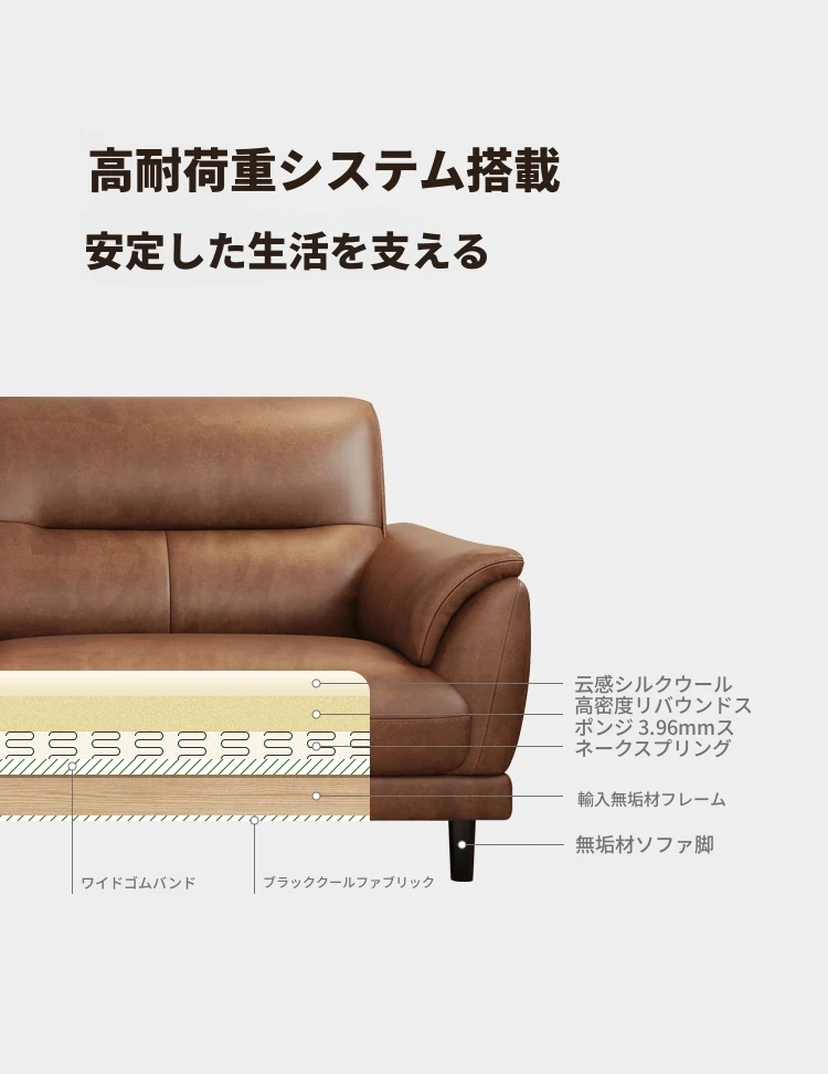 期間限定特価-高品質版【エコ牛革≈1.8mm】(4人掛け2.1m)45D高反発ウレタン+無垢材フレーム キャラメル色