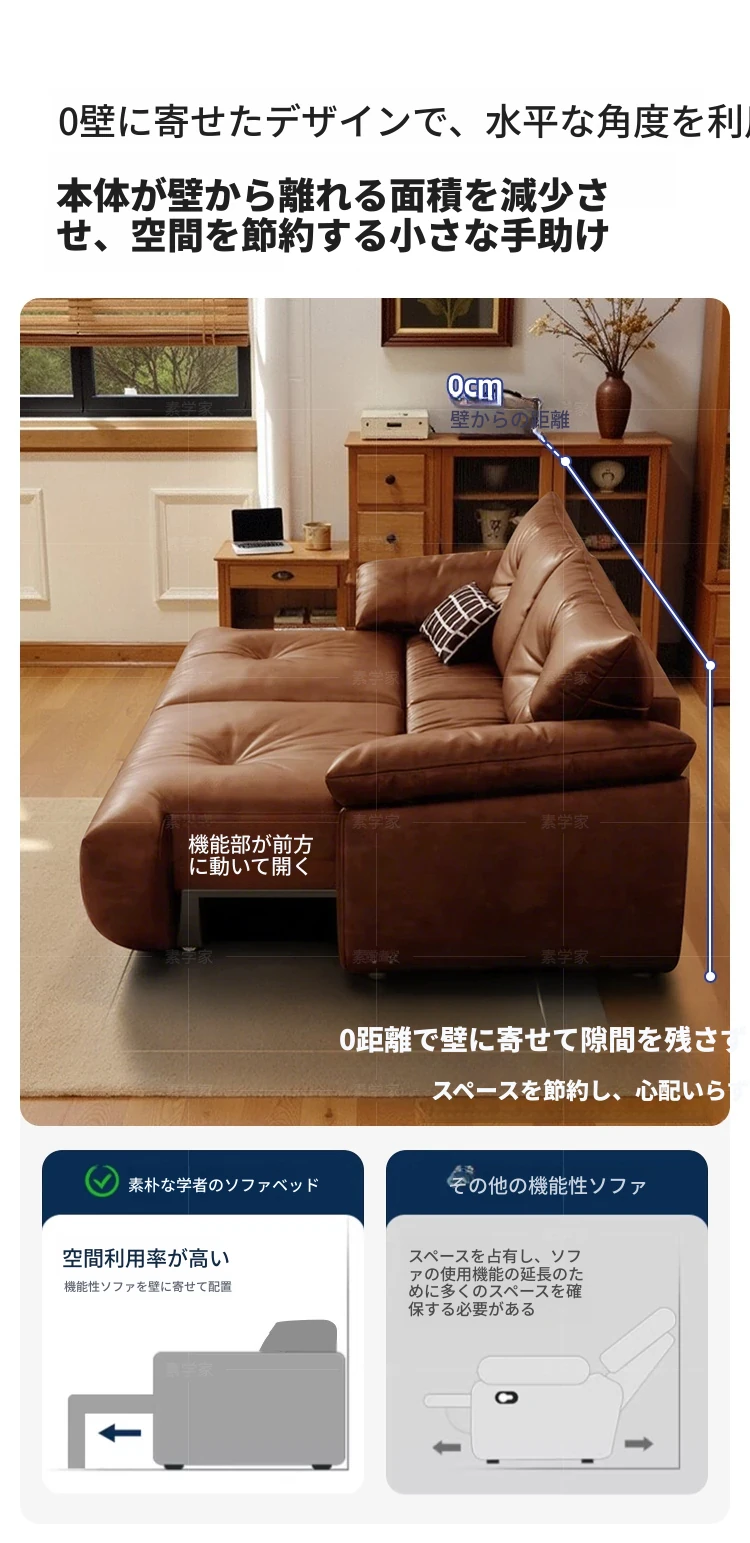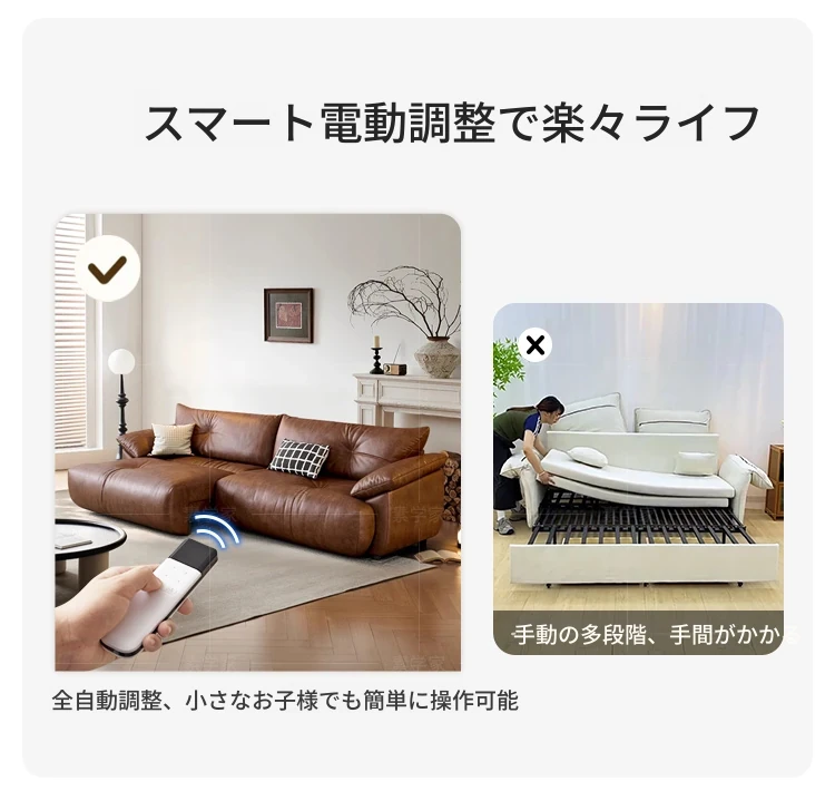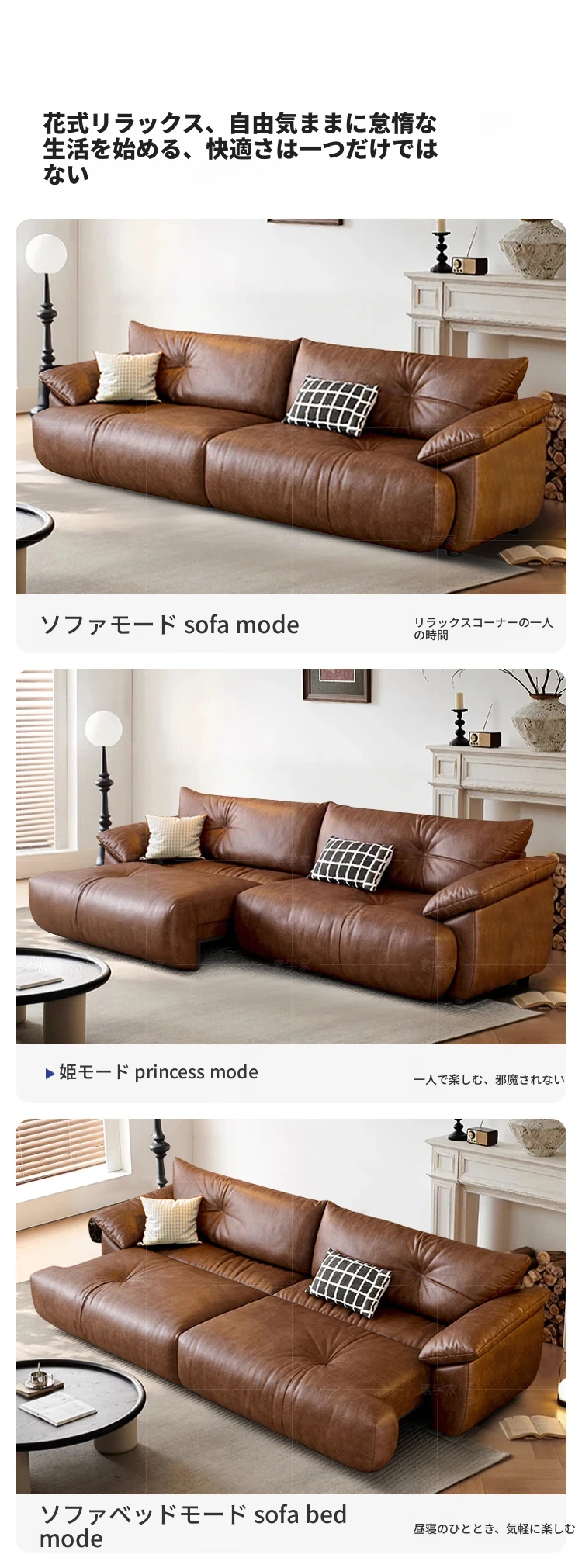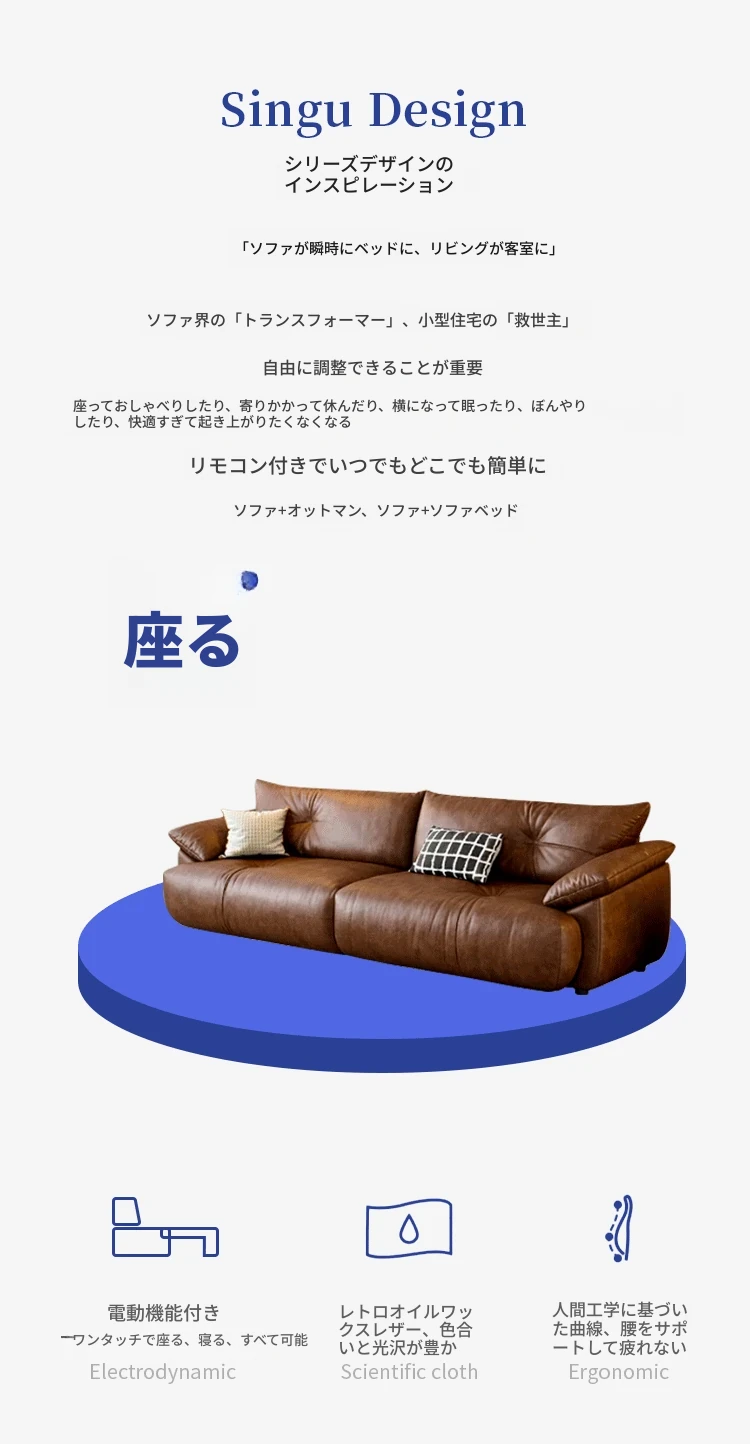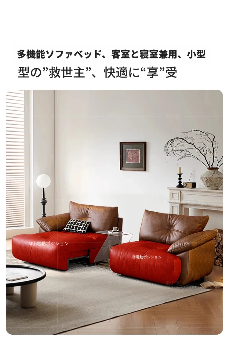 素学家 フランス風レトロ 電動ソファ リビングルーム用 調整可能な伸縮機能 中古風オイルワックスレザー布製 ソファベッド - スタイリッシュで快適な空間を演出!