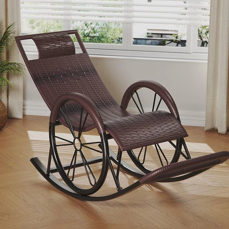 夏のリラックスに最適!藤編みのラウンジチェア - 大人も楽しめる快適な揺り椅子。お年寄りにも優しいデザインで、バルコニーやお家でゆったりと過ごすための必需品です。