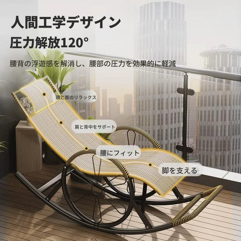 夏のリラックスに最適!藤編みのラウンジチェア - 大人も楽しめる快適な揺り椅子。お年寄りにも優しいデザインで、バルコニーやお家でゆったりと過ごすための必需品です。