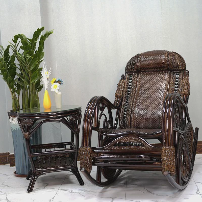 リラックスできる本物のラタン製大人用バルコニー用ロッキングチェア - お昼寝にも最適な高齢者向けの快適な藤編みゆったりチェア!