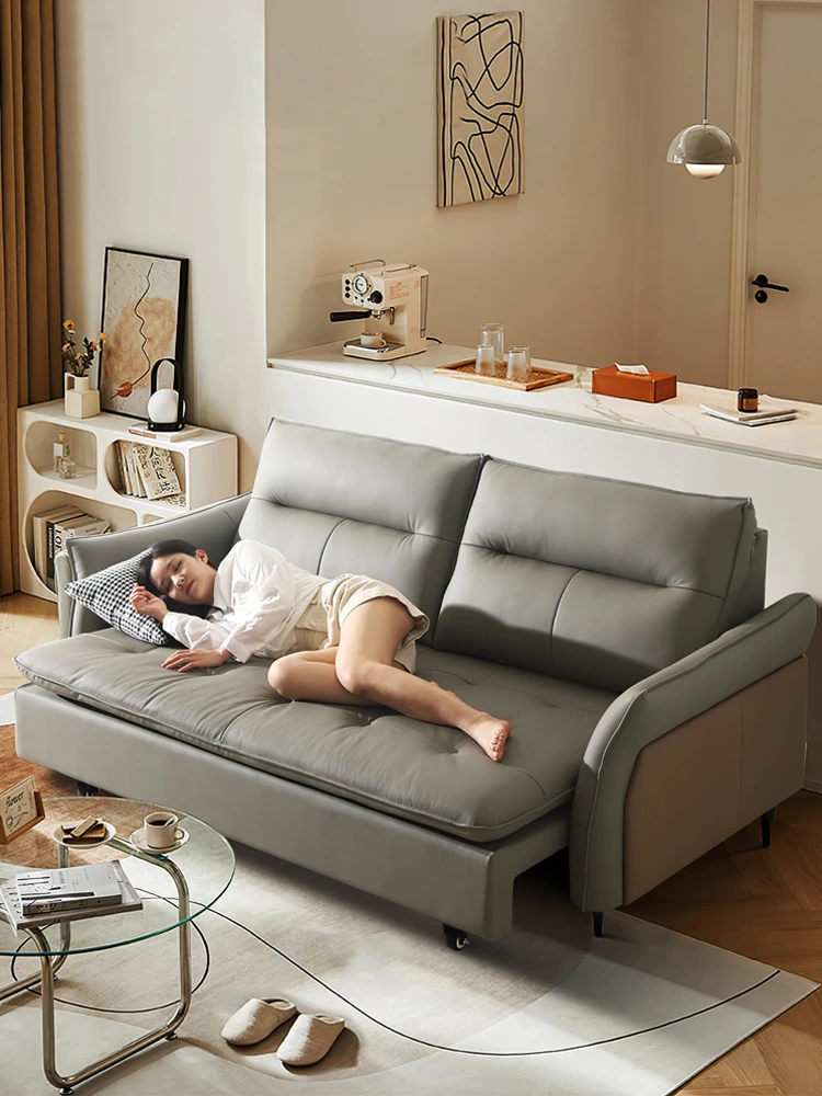 モダンミニマリストデザインの本革電動ソファベッド|リビングにぴったりな多機能小型ソファ|壁際に置ける省スペース設計で、快適な座り心地と寝心地を実現!