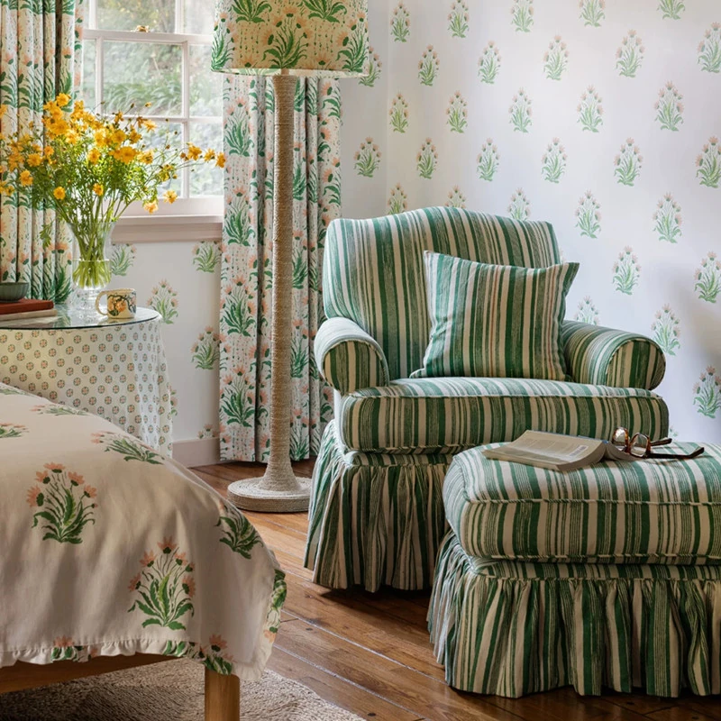 フレンチヴィンテージ生地のソファチェア、一人掛け、コンパクトなバルコニーに最適!田舎風アメリカンデザイン、ダウンストライプでリラックスできる民宿スタイル。おしゃれで居心地の良い空間を演出します!