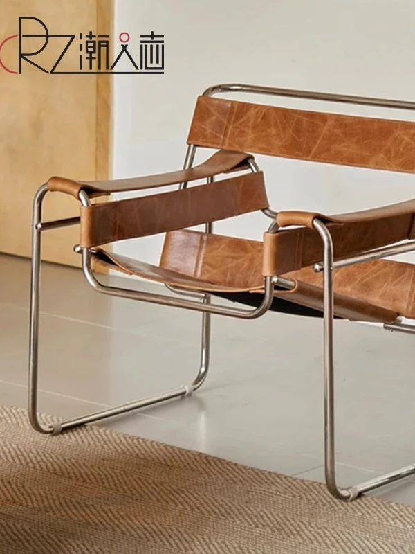 バシリー椅子|インスタ映えデザインの高級感溢れる一人掛け椅子|贅沢なサドルレザーとヴィンテージステンレススチールの融合|おしゃれなリラックス空間を演出します!